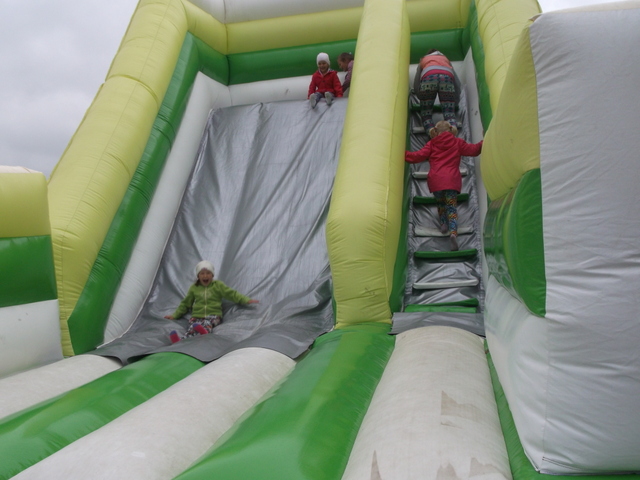 Dzień Dziecka w naszej szkole odbył się 2 czerwca w poniedziałek. Wszyscy z niecierpliwością wyczekiwali tego dnia i … pogody, bo główną atrakcją dnia była zabawa na dmuchanych zamkach. Zabawa rozpoczęła się od dyskoteki. Z samego rana chłopcy z klasy VI rozłożyli sprzęt grający i w rytmie tanecznej muzyki górny korytarz zapełnił się rozbawionymi dziećmi. Pomimo dobrej zabawy, ci najbardziej niecierpliwi, raz po raz spoglądali przez okno aby przekonać się, że zamki na pewno są przygotowywane do „natarcia”. O planowanej godzinie wszyscy ruszyli na podbój „dmuchańców”. Zabawa była przednia, nikomu nie przeszkadzał ani deszcz, ani zimno, ani nawet dłuuugie kolejki oczekujących. Niestety, pogoda nie dała za wygraną i w końcu padający deszcz przegonił nawet najbardziej wytrwałych. Ale nie ma tego złego, co by na dobre nie wyszło. W szkole czekało pyszne ciasto, napoje oraz małe co nieco, przygotowane przez kochane mamusie. Na zakończenie dnia, zmęczeni i zmoczeni uczniowie zasiedli w szkolnym kinie aby obejrzeć Harrego Pottera.