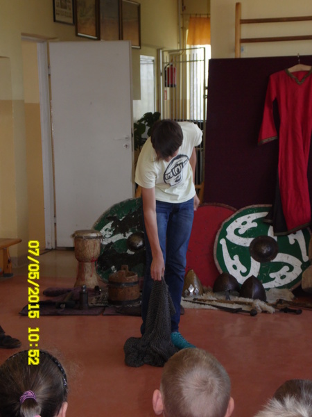 W dniu 07.05.2015 uczniowie naszej szkoły mieli okazję uczestniczyć w niezwykłej lekcji historii. Do szkoły przyjechali przedstawiciele Drużyny Wojów Słowiańskich Dąb-Pomorze z Torunia, którzy zaprezentowali nam lekcję ukazującą czasy od Mieszka I do Bolesława Krzywoustego. „Żywa” lekcja historii jest okazją do tego, aby ukazać wydarzenia historyczne w inny sposób niż na lekcjach historii. Podczas spotkania można było spotkać „prawdziwych” wojowników, dotknąć broni, ubrać się w ciężką kolczugę. Ważne jest to, że w takich przedstawieniach biorą czynny udział uczniowie i nauczyciele. Taka niecodzienna lekcja podobała się uczniom, którzy w łatwy i miły sposób przybliżyli sobie wiedzę o tamtych czasach.