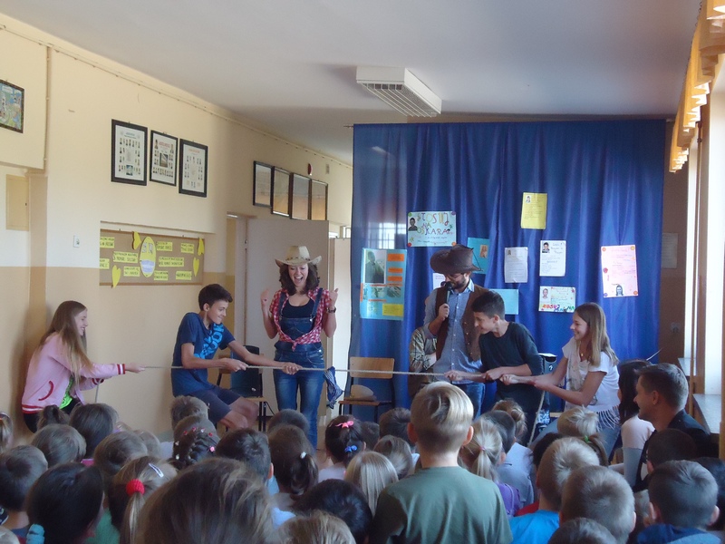 W czasie spotkania muzycznego uczestniczyliśmy w różnych zabawach. Młodsi ćwiczyli rzuty kapeluszem, starsi prezentowali swoja siłę, przeciągając linę.