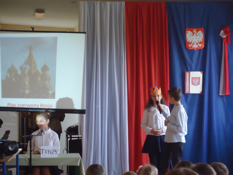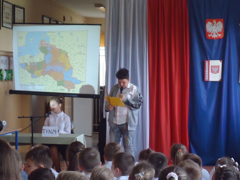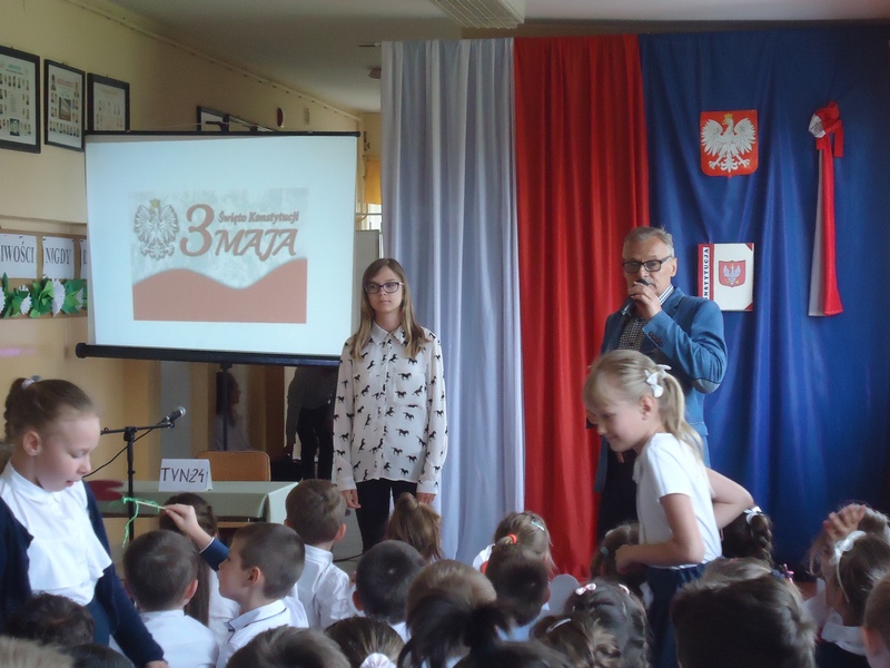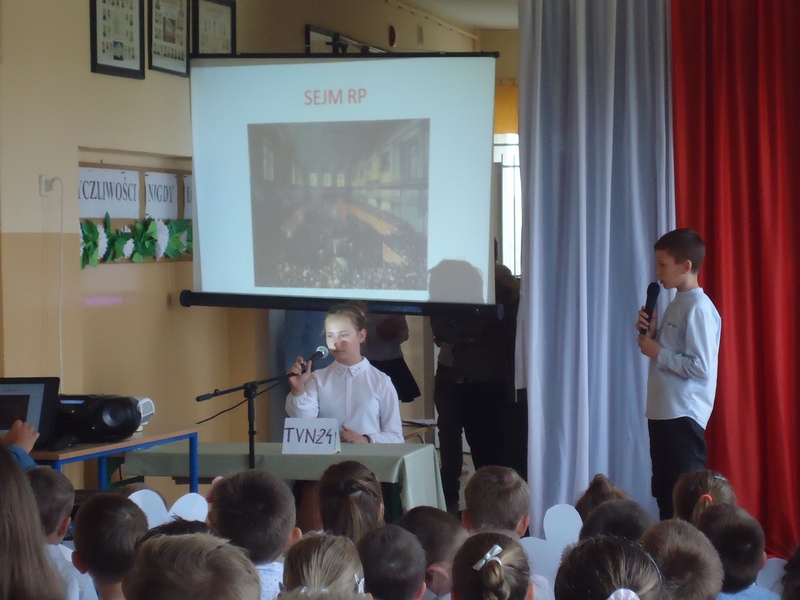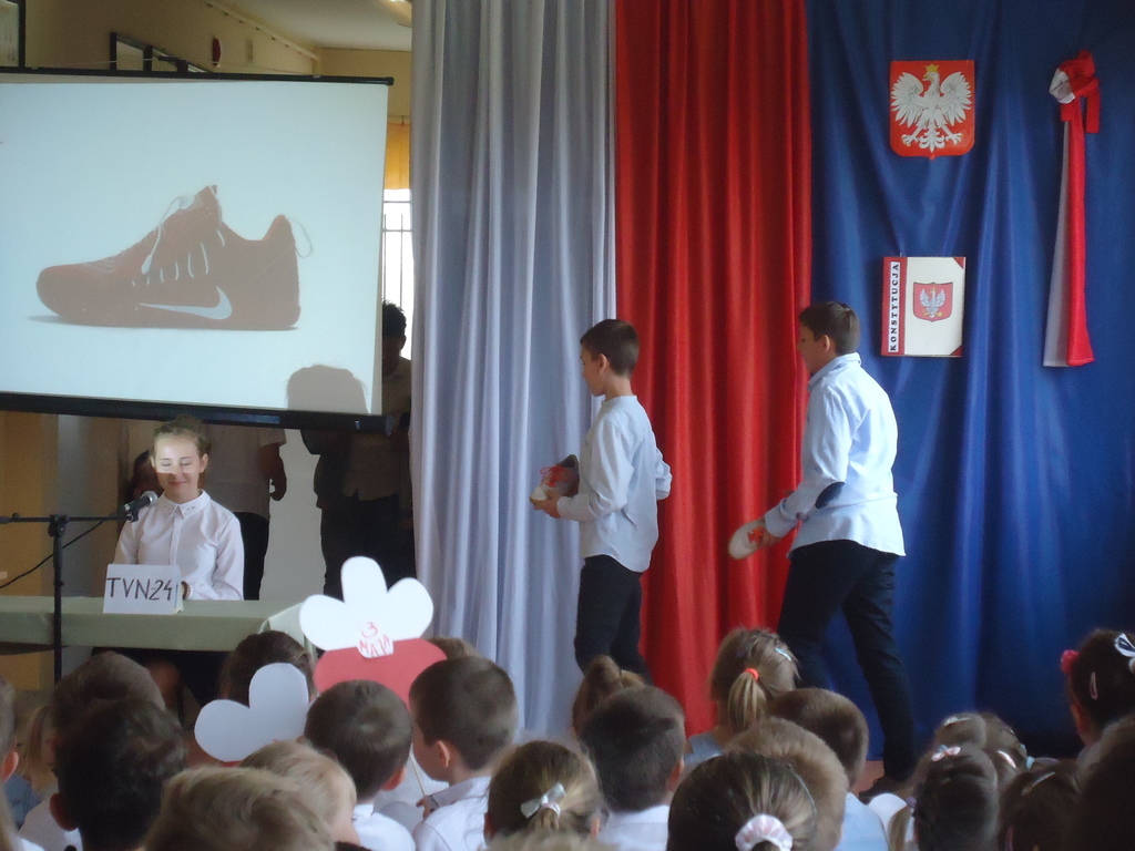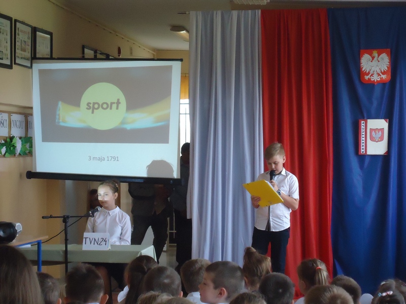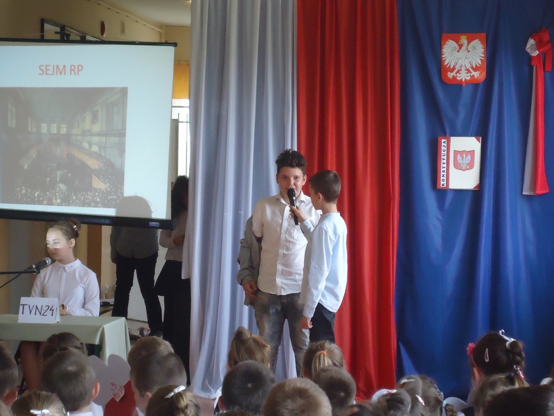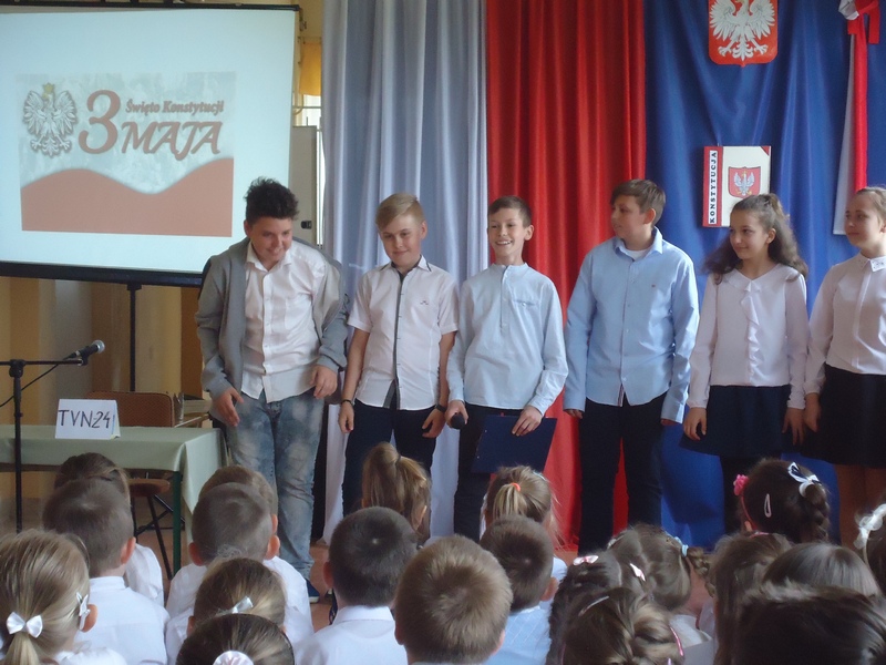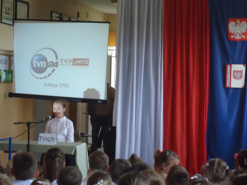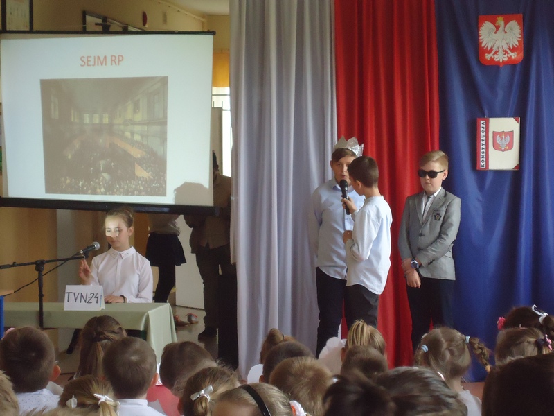 Apel rozpoczęliśmy od wspólnego odśpiewania hymnu Polski. Potem wydarzenia z 1791 roku w niecodzienny sposób przedstawiły nam koleżanki i koledzy z klasy V.