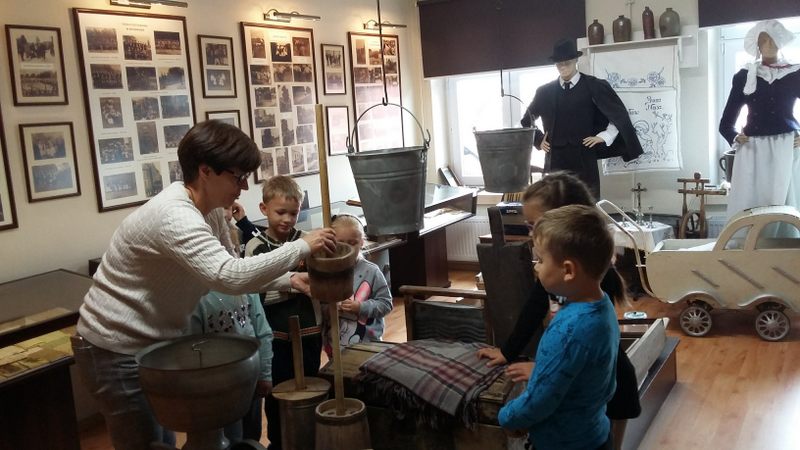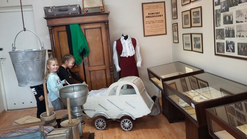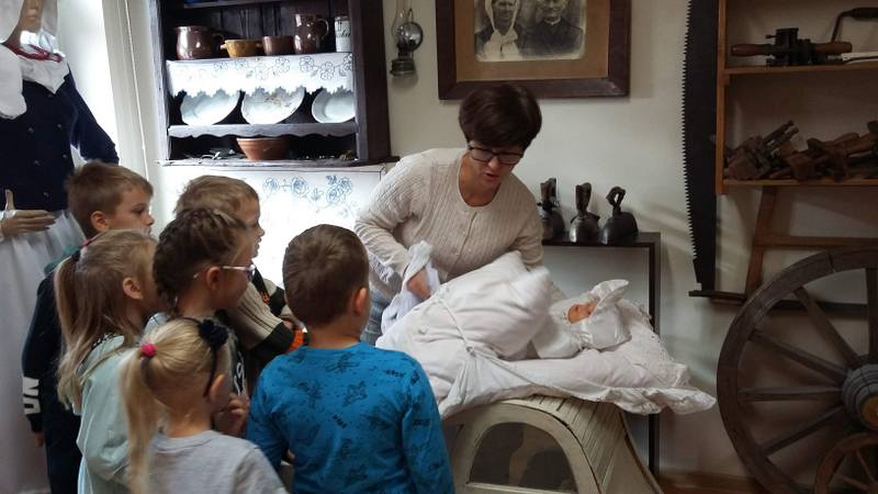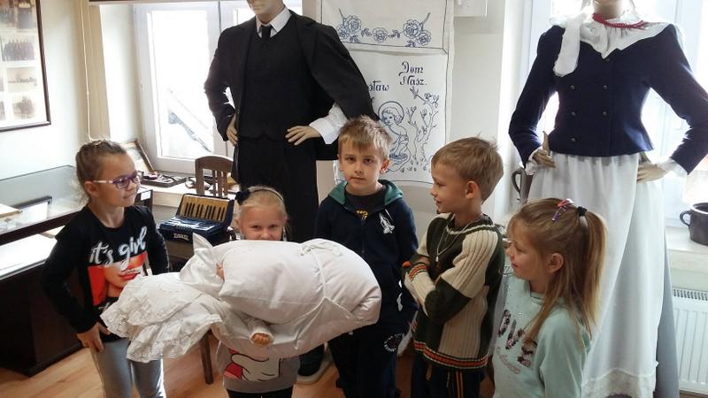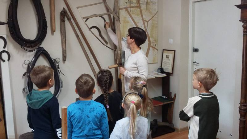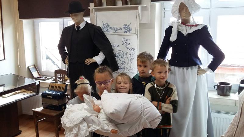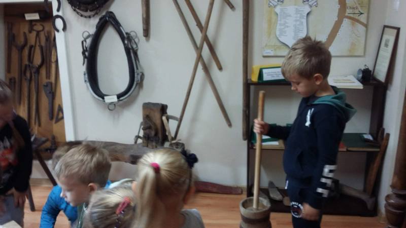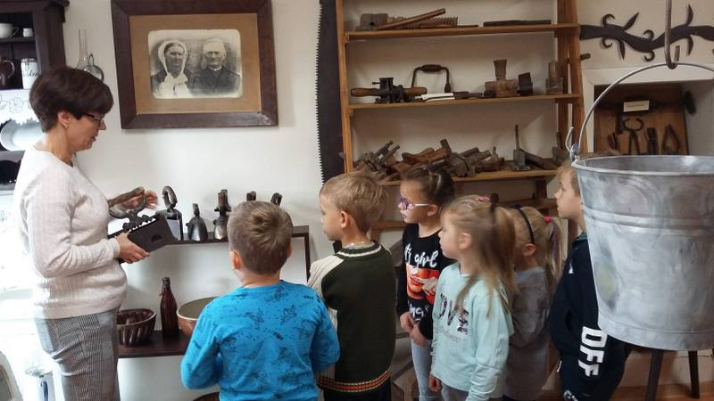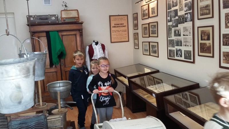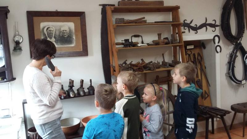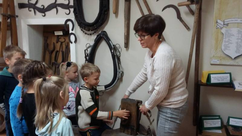 Istotnym punktem wycieczki było zwiedzanie Izby Regionalnej w Szkole Podstawowej w Wyszanowie. Tutaj sześciolatki spotkały się z serdecznym przyjęciem przez p. Joannę Wróbel - opiekunkę Regionalnej Izby. Wykorzystując zbiory Izby, m.in.: narzędzia kowala, kołodzieja, kuśnierza, szewca, przedmioty używane w dawnych gospodarstwach: żelazka, lampy naftowe, maselnice, dzieżę, cepy, chomąta, p. Asia w interesujący sposób wprowadziła wszystkich zwiedzających w odległe czasy i dostarczyła dzieciom niezapomnianych wrażeń. Zgromadzone eksponaty pozwoliły zapoznać się z minionymi, często bezpowrotnie, obrazami wsi. Przywołały codzienne życie mieszkańców, a także wydarzenia uroczyste, związane z tradycjami i obrzędami.