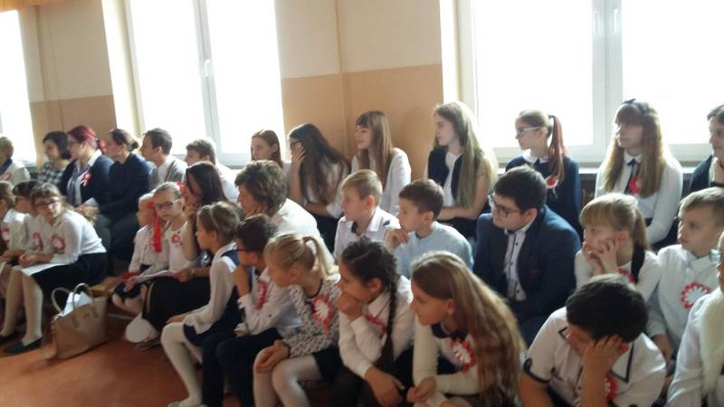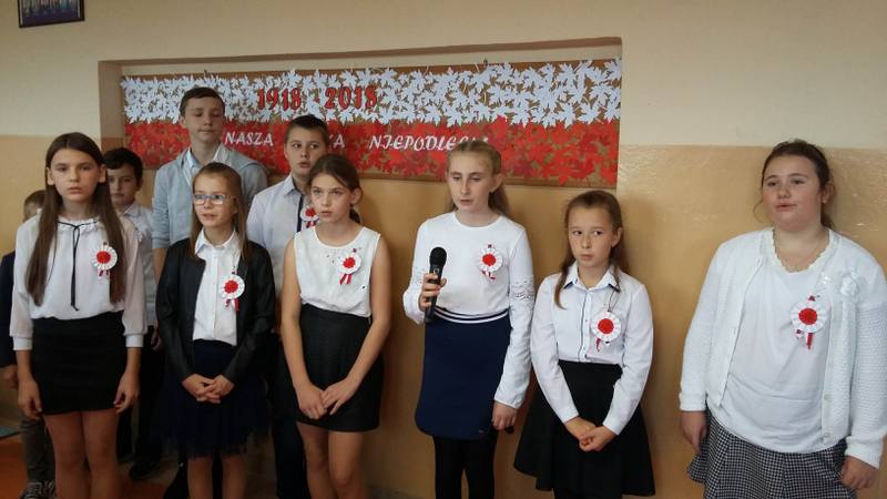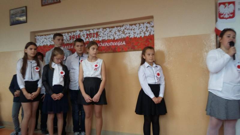 Dalsze radosne świętowanie miało miejsce na szkolnym korytarzu. Świąteczny wystrój korytarza w wykonaniu p. Jolanty Morty sprawił, że już przy wejściu udzielała się atmosfera wielkiego narodowego jubileuszu. Uroczystą akademię z okazji 100. rocznicy odzyskania niepodległości zainaugurowała p. Dyrektor - Anna Jakubowska. Pani Dyrektor wskazała małym Polakom na rolę wartości w życiu narodu, szacunku dla historii minionych pokoleń oraz obowiązku pielęgnowanie tradycji narodowych. Przeczytała też życzenia urodzinowe od uczniów szkoły na 100-lecie niepodległości Polski. Po krótkim wystąpieniu wszyscy przenieśli się do czasów, kiedy Polska zniknęła z map świata. Tegoroczny apel upamiętniający wyjątkową – 100. rocznicę odzyskania przez Polskę niepodległości - miał bardzo uroczysty charakter. Uczniowie z klasy V pod kierunkiem p. Angeliny Staniek przenieśli zebranych na karty niełatwej historii naszego kraju. Narrację przeplatały wiersze i pieśni patriotyczne, które ukazały widowni momenty trudne i tragiczne, ale pokazały też bohaterstwo i patriotyzm Polaków, którzy pomimo ciężkich czasów, nie zaniechali walki o swoją Ojczyznę. W śpiew pieśni patriotycznych włączyli się uczniowie z innych klas oraz nauczyciele. Zebrani obejrzeli również film: „Animowana historia Polski”. Uczniowie klasy V perfekcyjnie i z przejęciem przekazali przygotowaną część artystyczną.