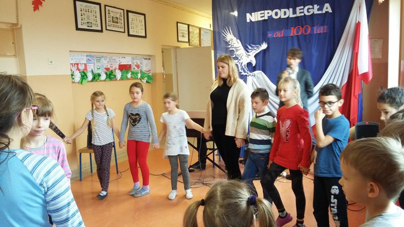 Staropolskim zwyczajem - polonez fortepianowy „Pożegnanie Ojczyzny” Ogińskiego, jeden z najbardziej znanych w Polsce polonezów - rozpoczął listopadowy koncert. Następnie wszyscy zebrani, pod kierunkiem prowadzącej koncert, wyrecytowali wiersz „Kto ty jesteś?” – Władysława Bełzy oraz zaśpiewali jedną z najpiękniejszych i najbardziej znanych polskich pieśni patriotycznych – „Płynie Wisła, płynie”. Ta wartościowa pieśń wychwalająca Polskę pełniła rolę wychowawczą szczególnie w czasach okupacji i niewoli. Na koncercie nie zabrakło ulubionej pieśni Marszałka Józefa Piłsudskiego „My Pierwsza Brygada” powstałej pod koniec I wojny światowej. Podczas spotkania uczniowie nauczyli się refrenu piosenki „Jedzie, jedzie na Kasztance”, znanej również jako „Pieśń o Wodzu miłym”. Spośród wielu pieśni, jakie napisano o Józefie Piłsudskim, ta jest obecnie najbardziej popularna. Utwór był obowiązkową edukacją patriotyczną dla uczniów szkół w okresie rządów sanacji. Niezwykłych doznań dostarczyła wszystkim jedna z najbardziej znanych polskich pieśni wojskowych i patriotycznych z czasów I wojny światowej – „Białe róże”, znana także pod tytułem „Rozkwitały pąki białych róż”. „Białe róże” były wykonywane i nagrywane przez wielu artystów. W dalszej części koncertu uczniowie wspólnie z artystami zaśpiewali pieśń wojskową „Wojenko, wojenko” , która zajmowała szczególne miejsce w sercach żołnierzy. Była często publikowana w różnych śpiewnikach, szczególnie żołnierskich.