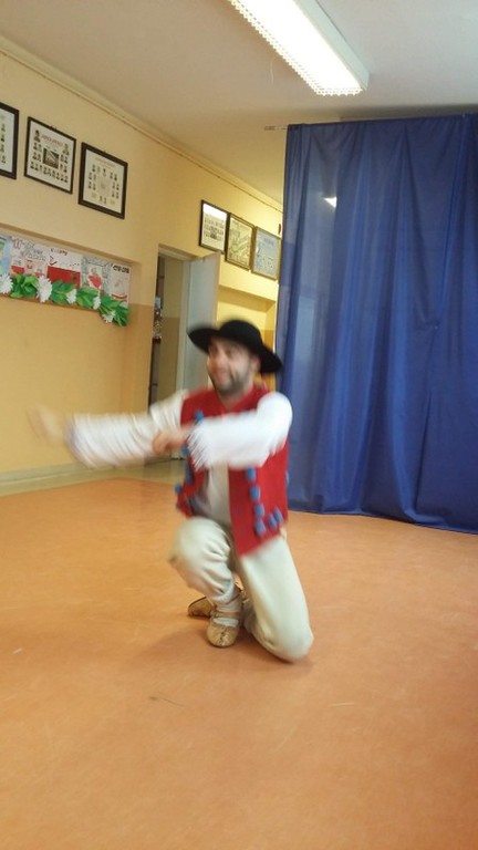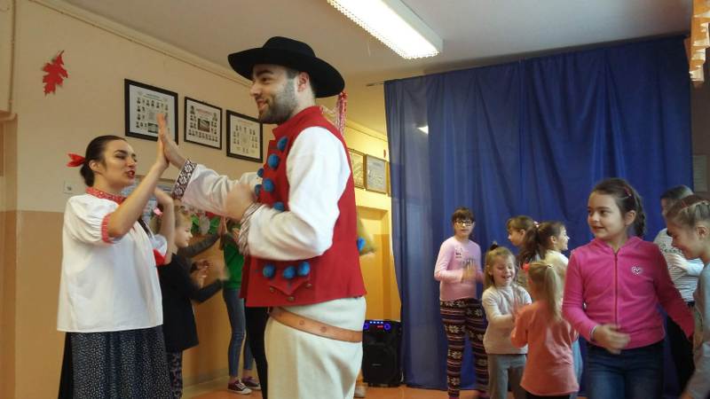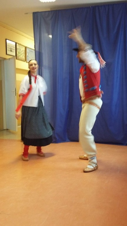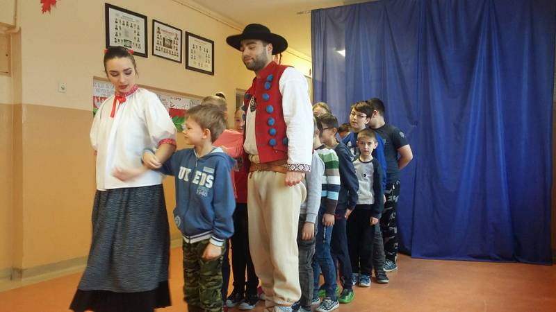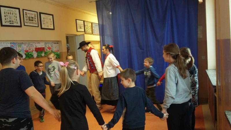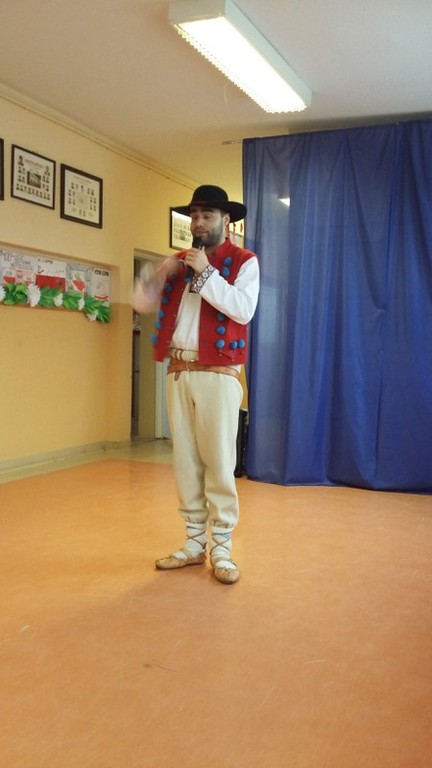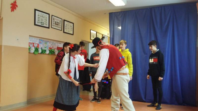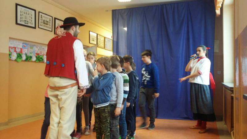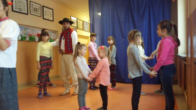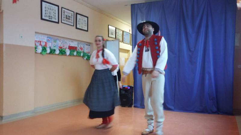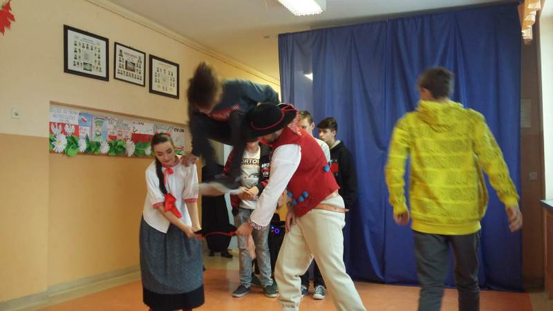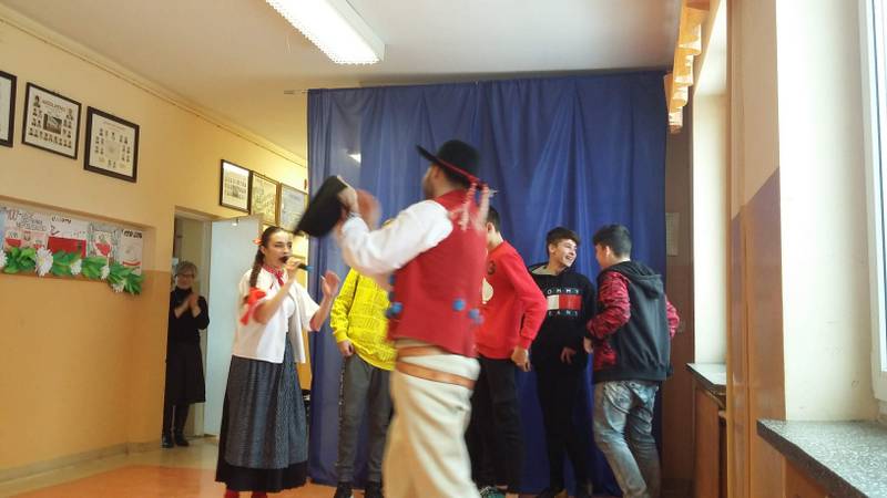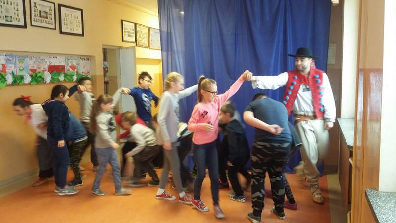 Folklor Beskidu Śląskiego to przede wszystkim tańce zabawowe, obrzędowe i weselne. Dzięki koncertowi uczniowie poznali najbardziej popularne tańce Górali Śląskich, takie jak: kołomajki, rejna, piłka, klapok, świniok, charakteryzujące się niesamowitą werwą i żywiołowością. Tańce energiczne przeplatane były spokojniejszymi a także melodycznymi przyśpiewkami. Uczniowie naszej szkoły - z pomocą tancerzy - w szybkim tempie opanowali tekst i włączyli się do zabawy owczareczek.