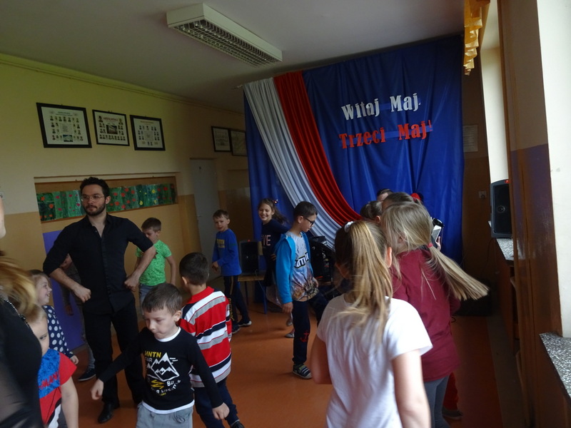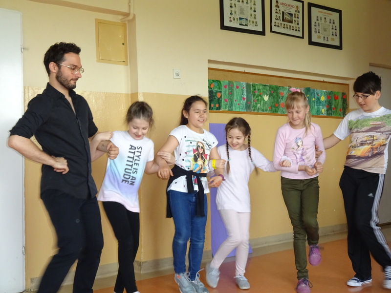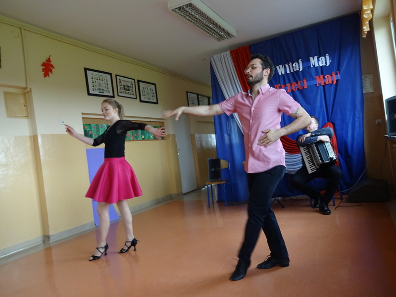 Artyści, niektórzy znani z poprzednich spotkań z muzyką, odbyli razem z nami - uczestnikami spotkania - wędrówkę taneczną po Europie. Byliśmy w Austrii, Francji, Hiszpanii, Włoszech, Czechach, Grecji. Obejrzeliśmy m.in. układ taneczny do muzyki J. Straussa: walc ''Odgłosy wiosny" oraz hiszpański taniec paso doble symbolizujący corridę, gdzie tancerz wciela się w rolę torreadora, a tancerka symbolizuje czerwone sukno. Nie zabrakło taranteli– włoskiego tańca ludowego z Neapolu. Nazwa tańca pochodzi prawdopodobnie od miasta Taranto lub nazwy pająka – tarantuli. Według wierzeń ludowych taniec miał leczyć z jadowitego ukąszenia. Również uczestnicy muzycznego spotkania mieli okazję do zaprezentowania się w tańcu. Dzieci młodsze spróbowały swoich sił w polce - powszechnym w wielu krajach tańcu ludowym o czeskich korzeniach. Uczniowie z klas starszych natomiast z tańcem Zorby odwiedziły Grecję. Oczywiście wszystko się działo pod kierunkiem profesjonalnych tancerzy. Z przyjemnością obejrzeliśmy też cha chę do utworu Mambo Italiano. Poza tańcem usłyszeliśmy także kilka utworów granych na akordeonie, m.in. walczyk francuski najpiękniej śpiewany przez Edith Piaf. Wspólnym hiszpańskim tańcem do piosenki Asereje zakończyła się majowa audycja muzyczna.