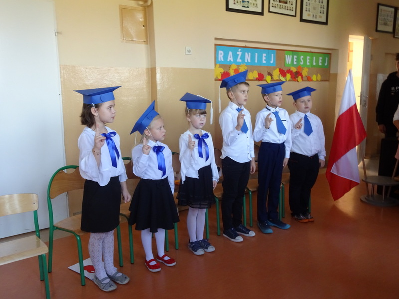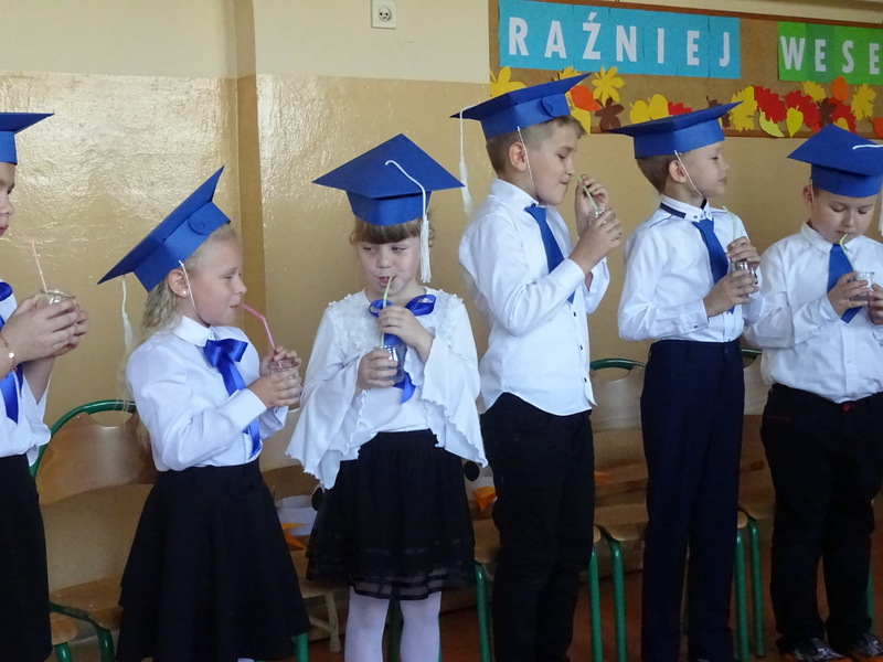 Po odśpiewaniu hymnu państwowego, Dyrektor Szkoły – Anna Jakubowska serdecznie powitała wszystkich zebranych na uroczystości ślubowania i pasowania na pierwszoklasistę. Ciepłe słowa do głównych bohaterów wielkiej uroczystości skierowała także przewodnicząca SU. Potem nastąpiła część artystyczna w wykonaniu pierwszoklasistów. Na początku serdecznymi oklaskami powitali dobrą wróżkę, która obdarowała ich darem przyjaźni, uśmiechu, życzliwości, pracowitości oraz darem ostrożności. Niestety, niespodziewanie na scenie pojawiła się zła wróżka - bardzo zła i obrażona, że nie została zaproszona. Użyła swej czarodziejskiej mocy i zamieniła pierwszaków w żółtodzioby. Z pomocą dobrej wróżki udało się jednak złagodzić czary i zamiast prawdziwych dziobów dzieci dostały tekturowe. Ostatecznie, na ich prośbę, czarna wróżka usiadła z boku i zgodziła się nie przeszkadzać w uroczystości. Żeby pozbyć się dziobów dzieci musiały odwiedzić różne krainy i wykonać trudne zadania. Prowadząca udała się z nimi do krainy geograficzno–przyrodniczej, muzycznej, języka polskiego, matematyki, krainy ruchu drogowego oraz krainy grzeczności. Dzieci wspaniale recytowały wiersze, odpowiadały na pytania stawiane im przez starsze uczennice. Sprawnie udzielały odpowiedzi na stawiane im zagadki, śpiewały piosenki. Zdały egzamin na szóstkę, mogły zdjąć dzioby. Od dobrej wróżki dostały symbol pracy – pszczołę, symbol muzyki - klucz wiolinowy, symbol mądrości- sowę oraz serce – w nagrodę za to, że potrafią być grzeczni i żyć w przyjaźni.