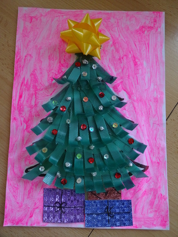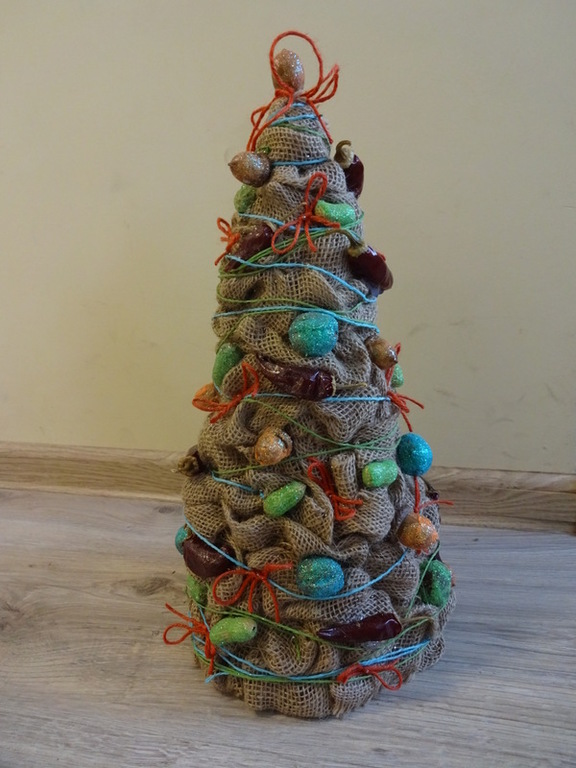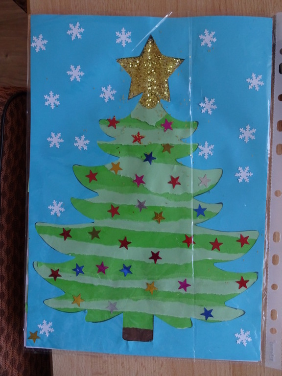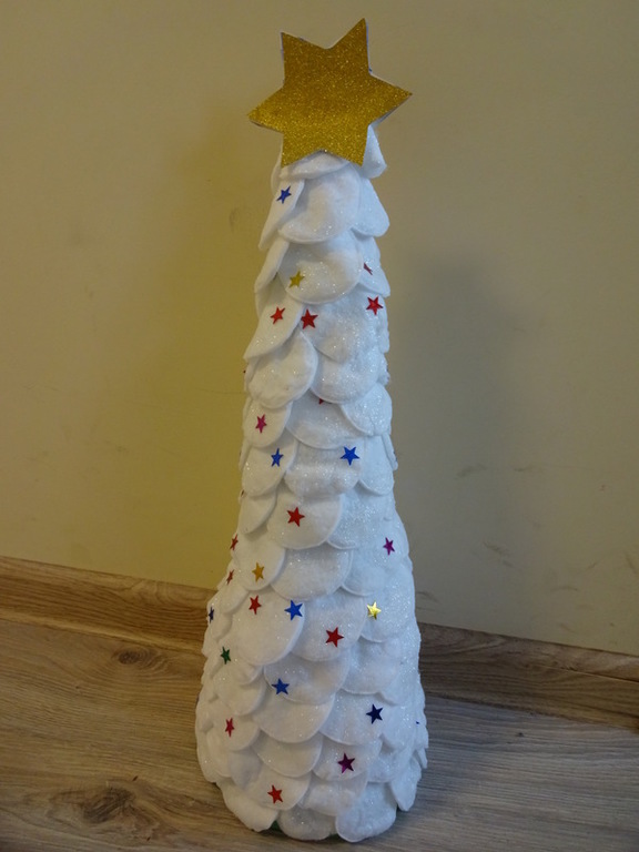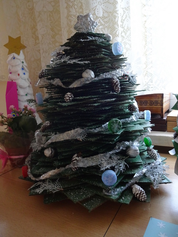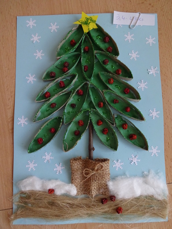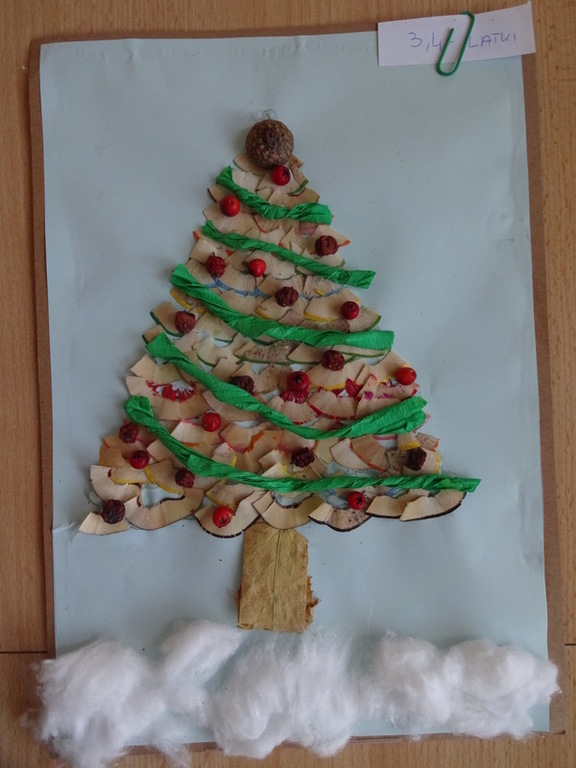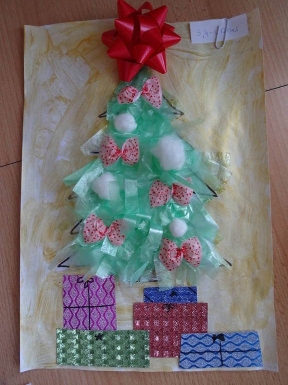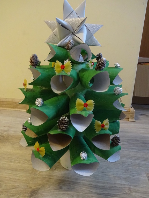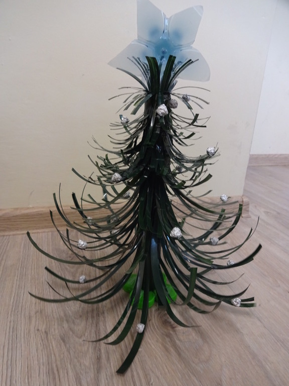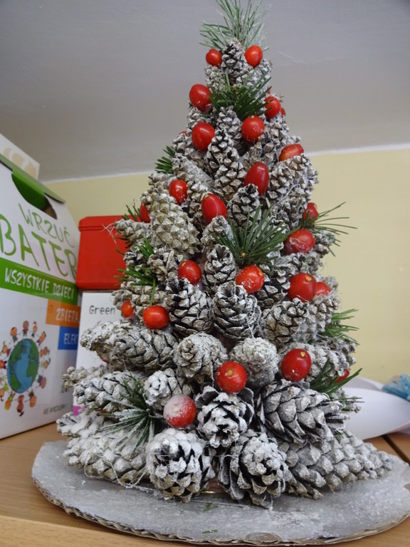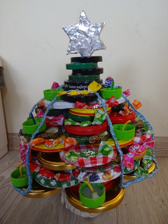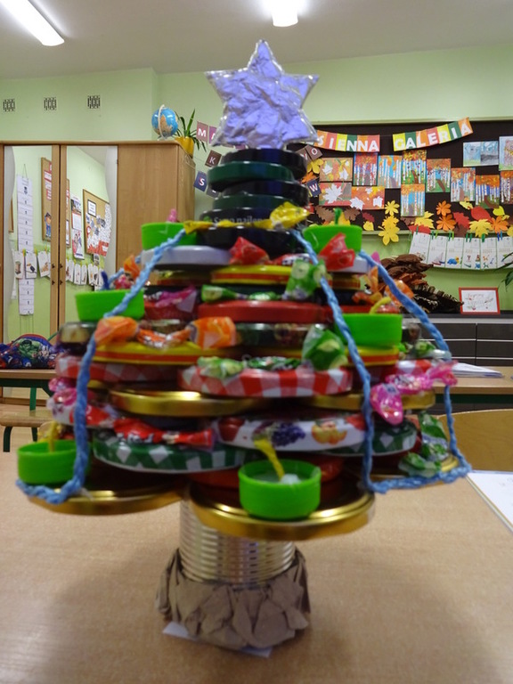 Znalazła się wśród 3 najlepszych prac w kategorii II. Szymek do wykonania swojej eko-choinki wykorzystał przede wszystkim nakrętki na słoiki, nakrętki plastikowe, puszkę, sznurki, papierki od cukierków.