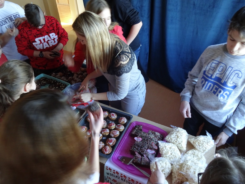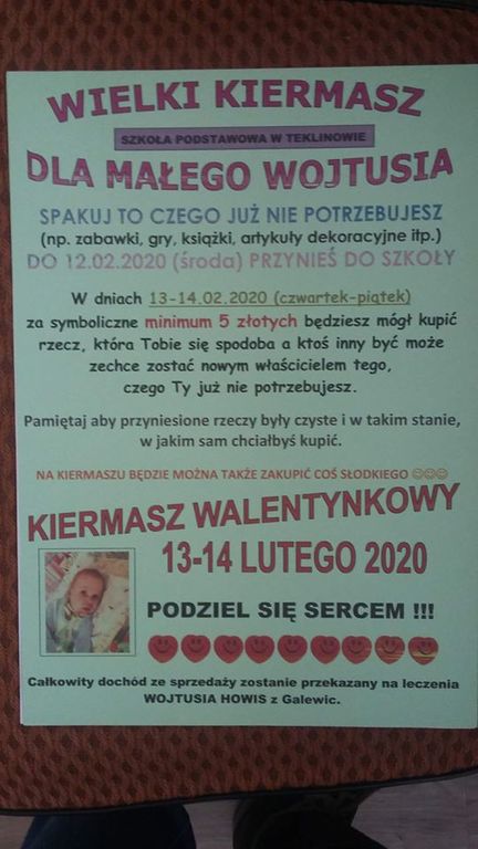 Akcje charytatywne uczą nas dostrzegać, że czasami bardzo blisko jest ktoś taki sam jak my, kto ma takie same potrzeby, ale niewielkie możliwości, aby je zrealizować. Uczniowie z Teklinowa chętnie uczestniczą w takich akcjach. Mają świadomość, że każda pomoc jest na wagę złota. Tak też postąpili tym razem. Poprzez Fundację Siepomaga włączyli się w zbiórkę na najdroższy lek świata dla Wojtusia Howis i Frania Marcinkowskiego. Społeczność szkolna - długo się nie namyślając - uznała, że dzień 14 lutego – Walentynki - to doskonała okazja, aby podzielić się sercem z drugim człowiekiem. Samorząd Uczniowski przygotował zabawy zw. z Walentynkami, a także z pomocą nauczycieli zorganizował WIELKI KIERMASZ DLA MAŁEGO WOJTUSIA. Można było zakupić zabawki, puzzle, gry, książki oraz wiele innych rzeczy. Dużym zainteresowaniem cieszyły się różnego rodzaju ciasta domowej roboty przygotowane przez rodziców, nauczycieli i samych uczniów. Dzięki wsparciu wszystkich darczyńców udało się zebrać kwotę 2410 zł dla chorego Wojtusia Howis z Galewic.