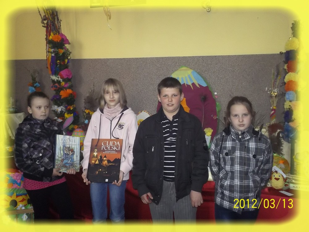 Uczniowie naszej szkoły wzorem lat ubiegłych wzięli udział w kolejnej edycji plastycznego konkursu wielkanocnego organizowanego przez Wieruszowski Dom Kultury i Gminę Wieruszów pod patronatem Burmistrza Wieruszowa.Tematyka prac konkursowych to: palma wielkanocna, big jajo, pisanka i stroik świąteczny. Rozstrzygnięcie konkursu odbyło się 31 marca 2012 roku, o godz. 11:00 w siedzibie WDK. Spośród 6 prac (które napłynęły na konkurs z naszej szkoły), prace czterech uczniów znalazły się wśród najciekawszych wyłonionych przez jury i umieszczone zostały na wystawie pokonkursowej. Z naszej szkoły laureatami zostali: