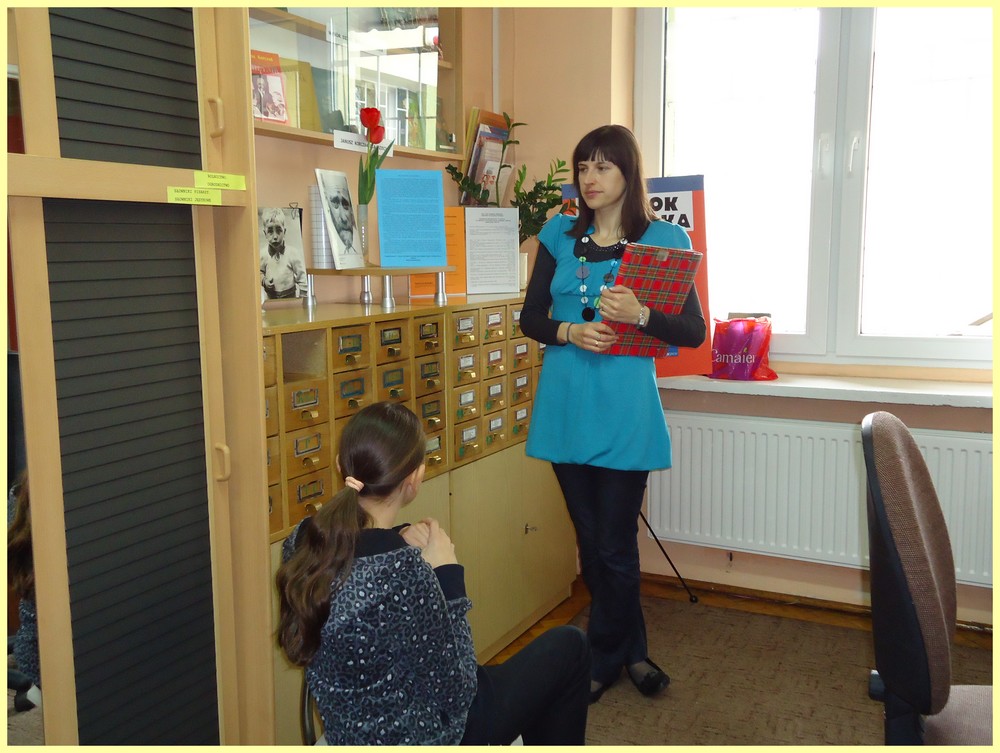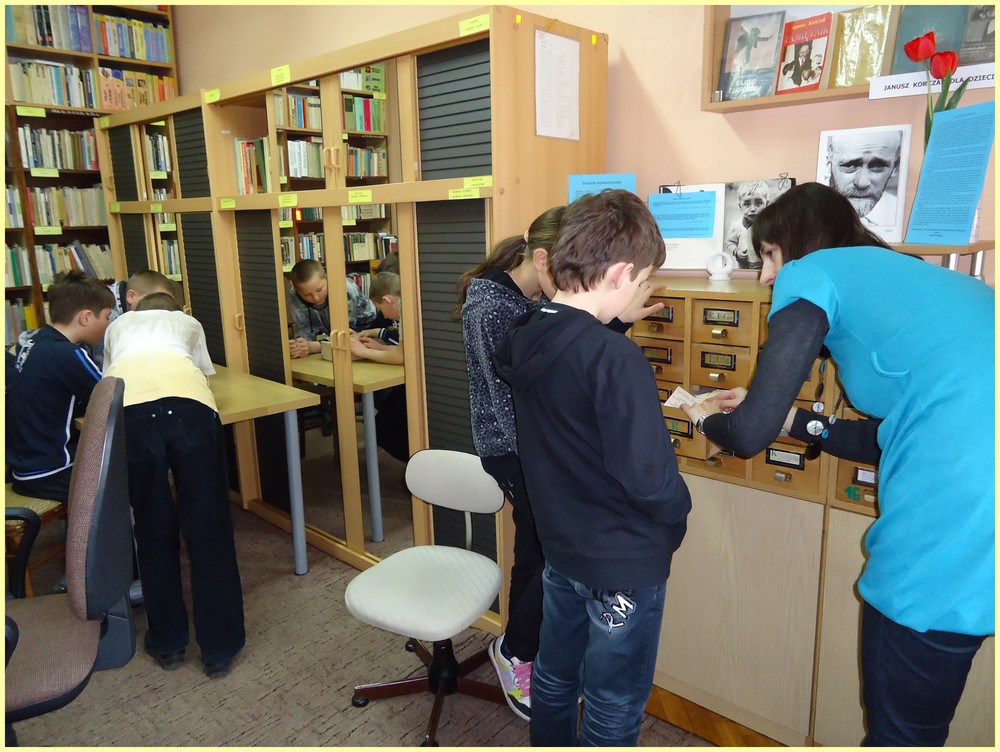 W środę ( 18.04.2012 r.) uczniowie klasy IV byli z wizytą w Bibliotece Pedagogicznej w Wieruszowie. Tam bibliotekarka - pani Elżbieta Żłobińska - opowiedziała im o życiu i twórczości Janusza Korczaka, patrona roku 2012 . W tym roku obchodzimy 70 rocznicę śmierci tego wielkiego człowieka- przyjaciela dzieci, który zginął w obozie koncentracyjnym w Treblince razem ze swoimi wychowankami z Domu Sierot w Warszawie. Pani Elżbieta przekazała uczniom wiele ciekawych informacji związanych z życiem Janusza Korczaka. Potem dzieci poznawały katalog alfabetyczny i ćwiczyły wyszukiwanie książek w tymże właśnie katalogu. Spotkanie upływało w miłej atmosferze. Podobną wizytę w bibliotece złożyli wcześniej uczniowie klasy V, a w przyszłym tygodniu wybierają się tam uczniowie klasy VI.