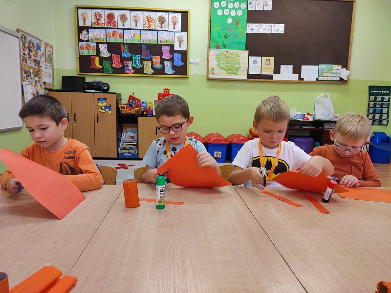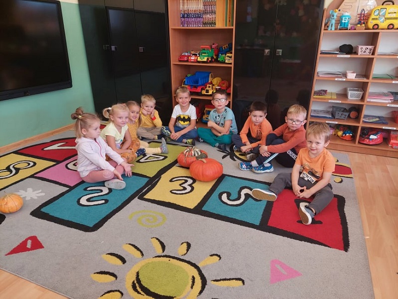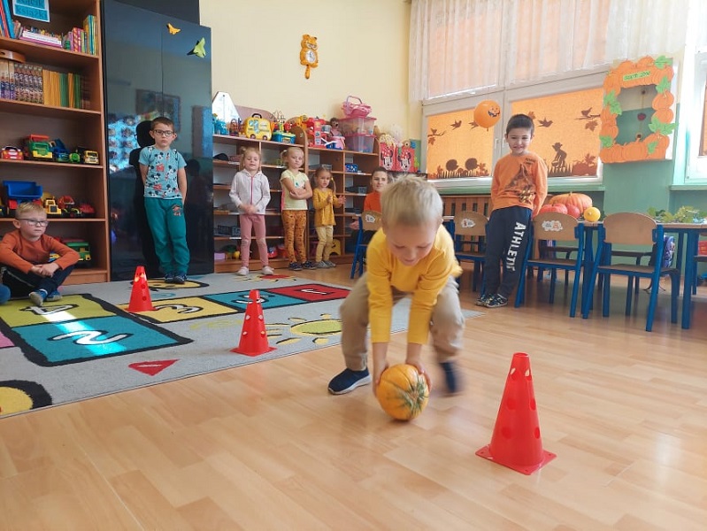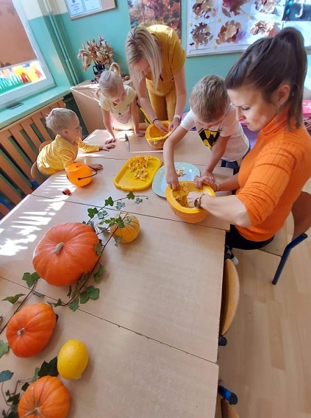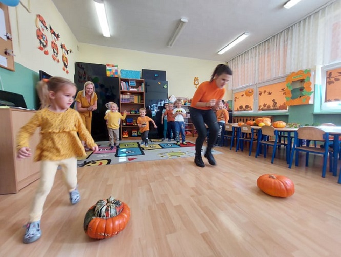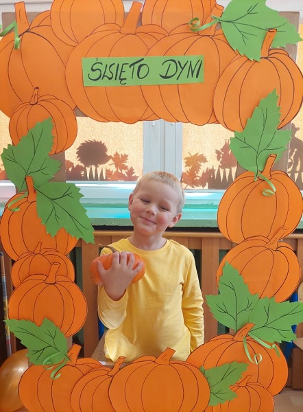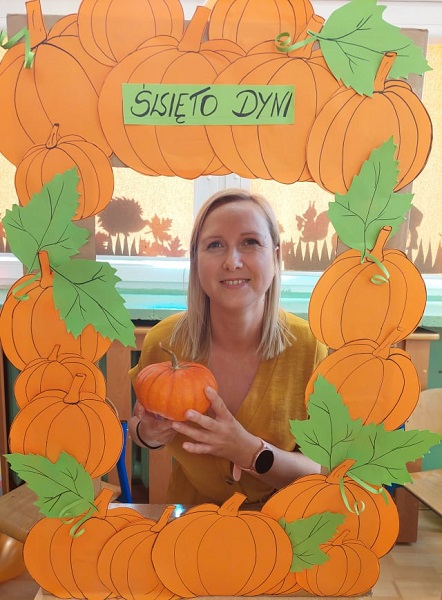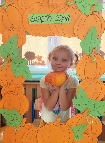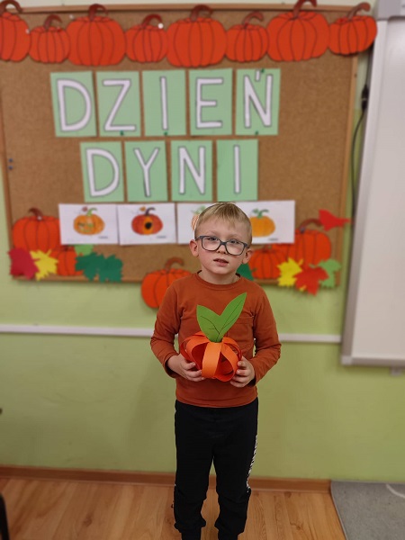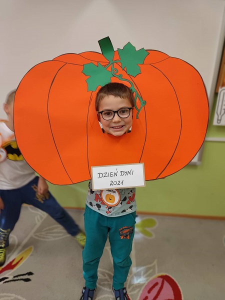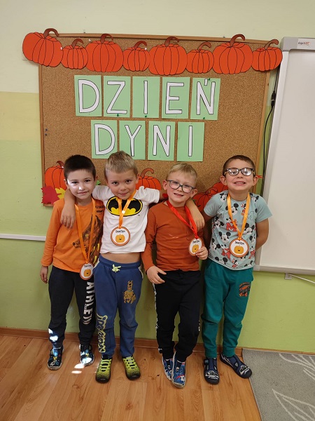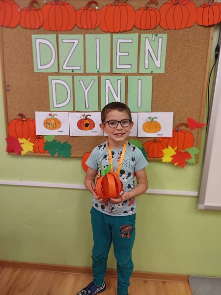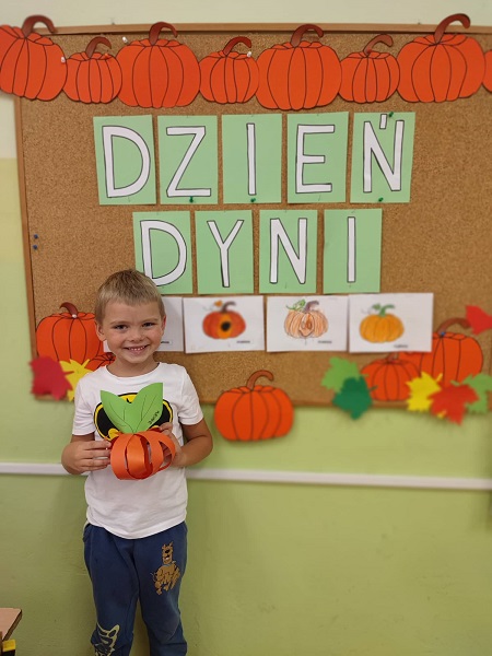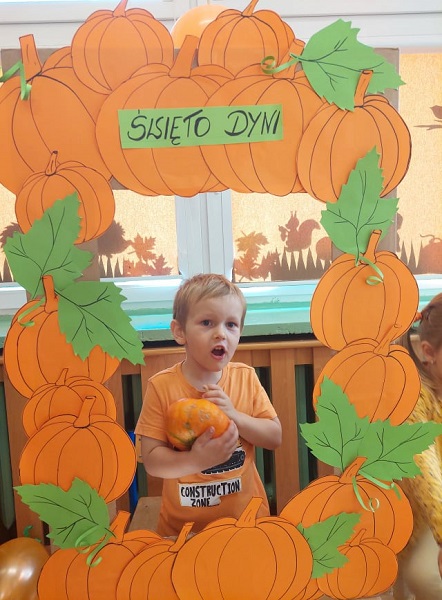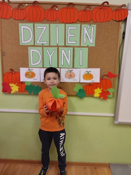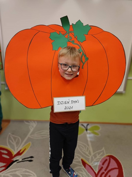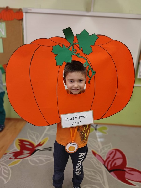 29 października przedszkolaki z naszej szkoły obchodziły Święto Dyni. Niestety czas chorób pokrzyżował frekwencje w obu grupach, ale obecnym w tym dniu humory dopisywały. Przedszkolaki poznały bardzo zdrowe i okazałe warzywo jakim jest dynia. Na jej cześć wśród ubrań dominował kolor pomarańczowy. Podczas obchodów Święta Dyni nie mogło zabraknąć wielu atrakcji. Zarówno starsze i jak i młodsze przedszkolaki wzięły udział we wspólnych grach i zabawach, gdzie główną rolę odgrywała dynia, m.in. slalom dyniowy, „gorąca” dynia, dyniowe zawody, zabawy z chustą animacyjną, zabawy ruchowe przy dyniowych piosenkach oraz wierszach. Ponadto przedszkolaki dokładnie „badały” dynię – jej ciężar, kolor, kształt a także wzięły udział w tzw. „burzy mózgów” na temat „Jakie przysmaki możemy wykonać z dyni?”. Przedszkolaki miały też okazję przekonać się co znajduje się w środku dyni oraz spróbować jej pestek, które okazały się zdrową i smakowitą przekąską. Starszaki wykonały swoje dynie jako podsumowanie minionego dnia. Na zakończenie dzieci otrzymały pamiątkowe medale oraz dyniowe lizaki. Miłą atrakcją były zdjęcia z fotobudki. Z pewnością to radosne święto pozostanie na długo w pamięci wszystkich przedszkolaków.