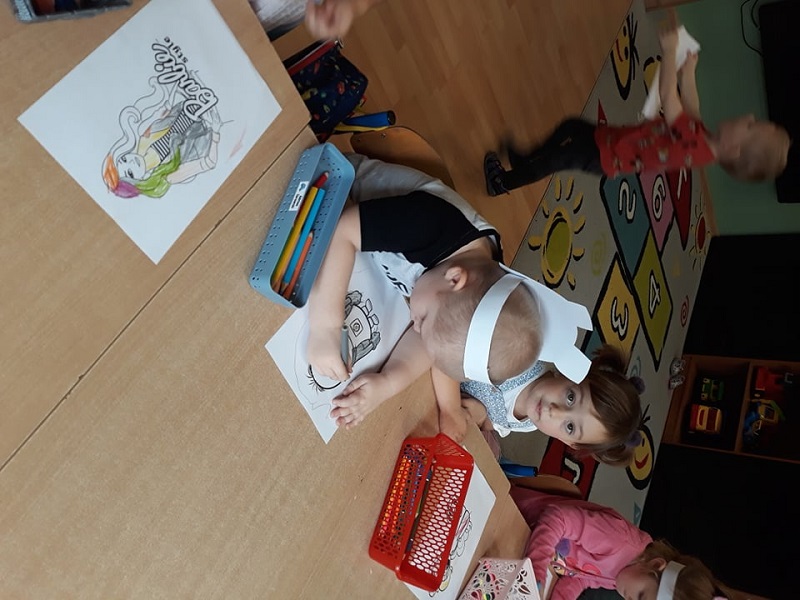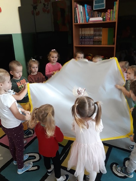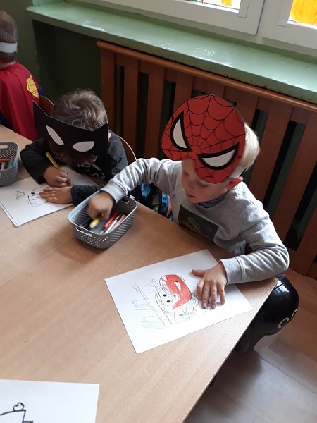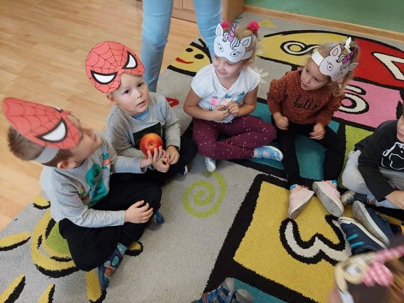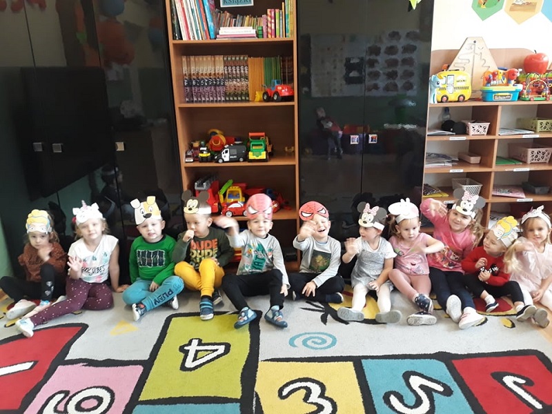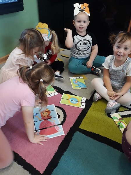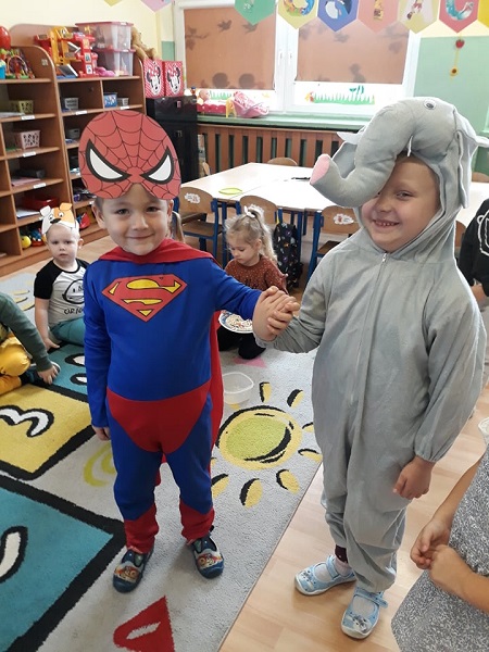 W najmłodszej grupie przedszkolnej sala zamieniła się w zaczarowaną krainę baśni, w której nie zabrakło oczywiście, księżniczek, wróżek oraz super-bohaterów. Dzieci opowiadały o swoich ulubionych bajkach, sprawdzały wiadomości na temat bajek i baśni poprzez konkursy, zagadki i baśniowe quizy. Brały udział w zabawach ruchowych, zabawach z chustą animacyjną oraz zamieniły się na moment w pomocników Kopciuszka, gdzie musiały jak najszybciej oddzielić fasolę od ziaren kukurydzy. Na zakończenie każdy przedszkolak pokolorował swoją ulubioną postać z bajki. Wszystkie przedszkolaczki otrzymały pamiątkowe dyplomy.