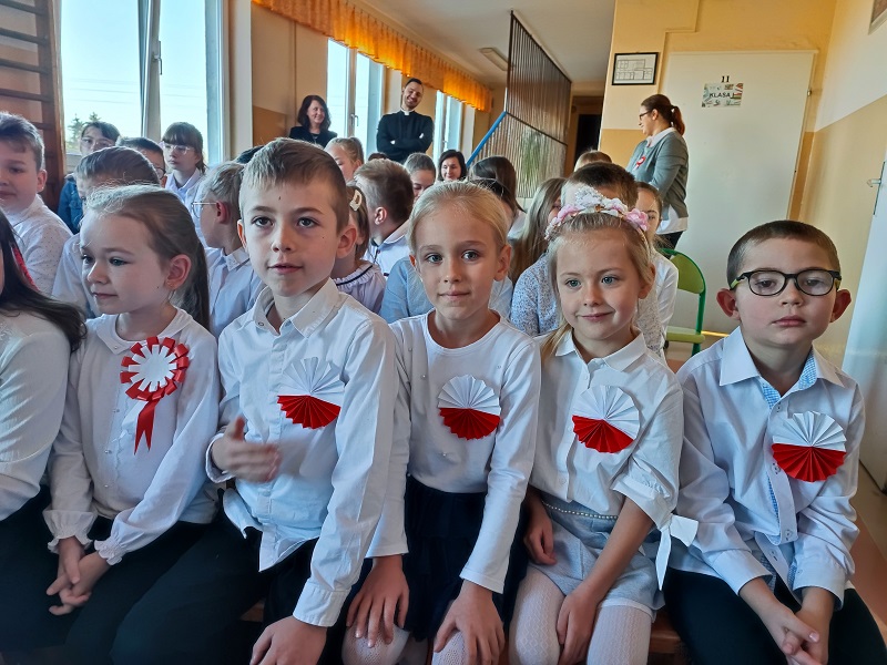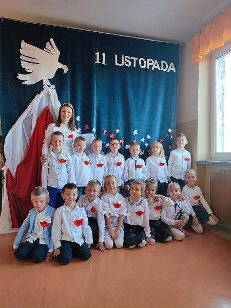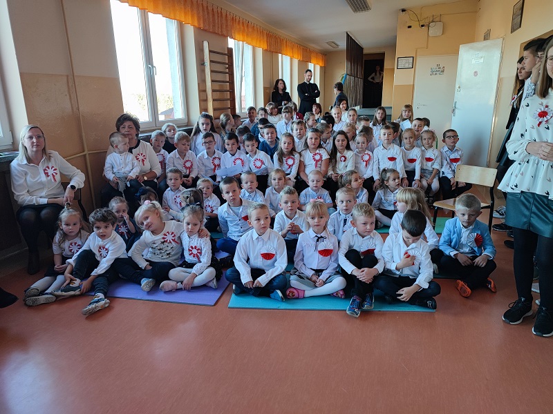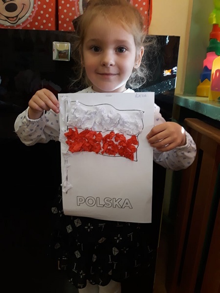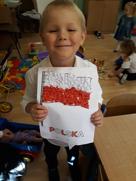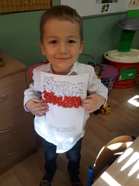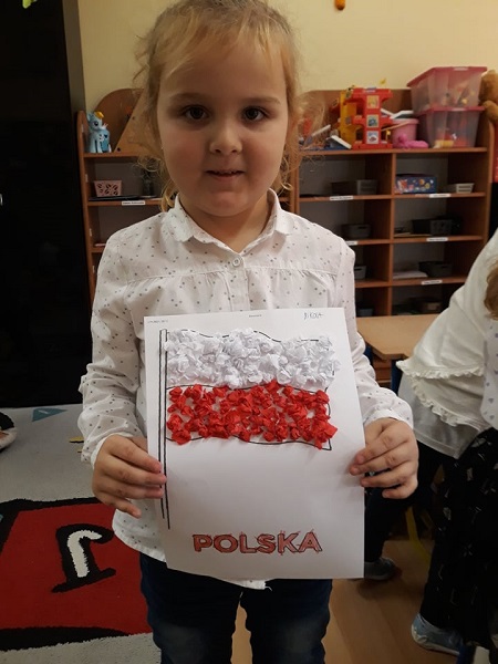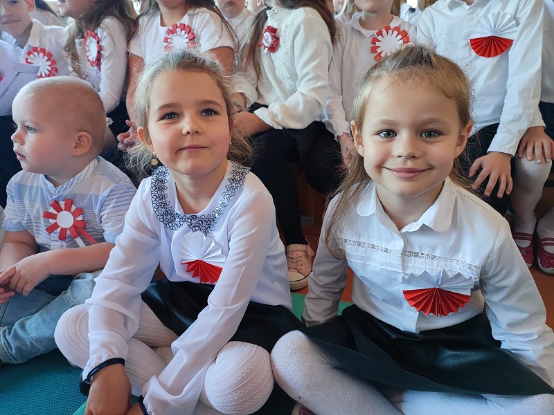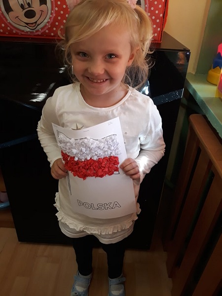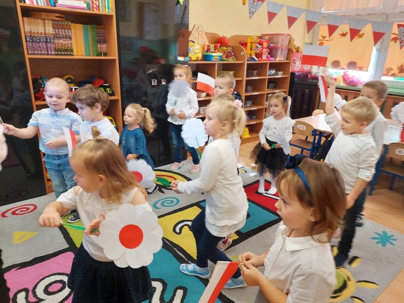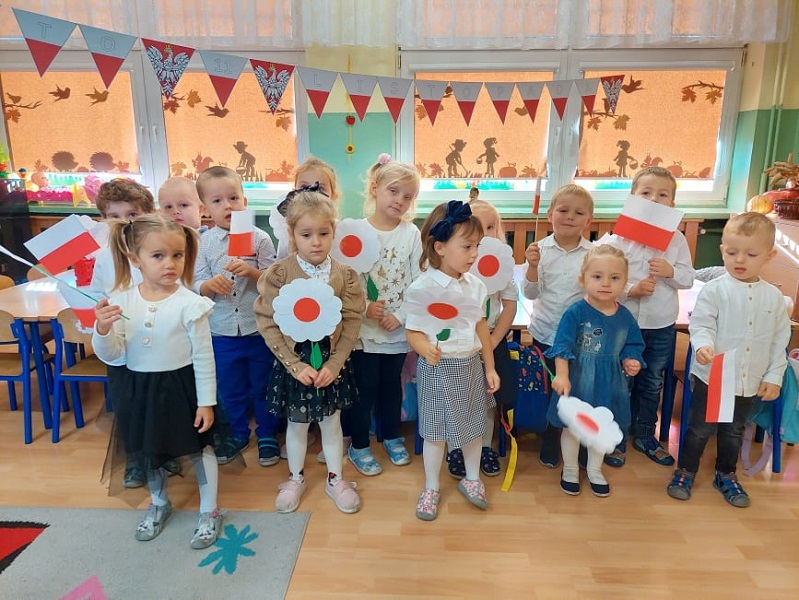 Przedszkolaki również świętowały. Wyglądały odświętnie i uroczyście, a na ich piersi widniały kotyliony w barwach narodowych. Wzięły udział w akcji #SzkołaDoHymnu, gdzie wspólnie ze społecznością szkolną odśpiewały hymn państwowy, recytowały wiersz „Kto ty jesteś? Polak mały”, zaśpiewały piosenkę „Przybyli ułani” oraz zatańczyły do piosenki „Jestem Polką i Polakiem” machając przy tym radośnie flagami. Jako podsumowanie zajęć maluszki z grupy Misie wykonały piękne flagi oraz otrzymały dyplomy „Małego patrioty” za piękne odśpiewanie hymnu narodowego. Był to bardzo radosny dzień w naszym przedszkolu i mamy nadzieję, że zapadnie on na długo w pamięci naszych „Małych patriotów”.
