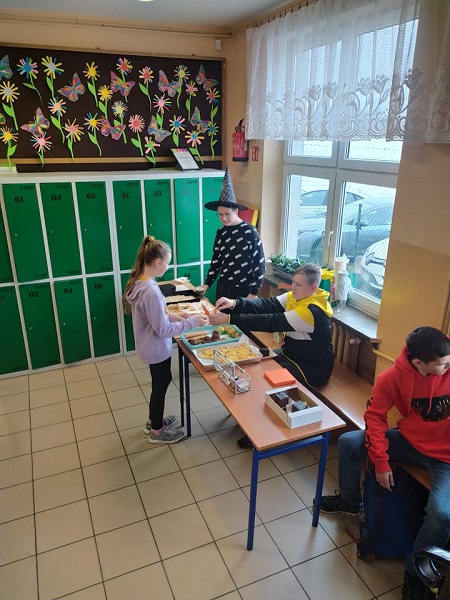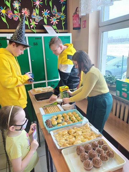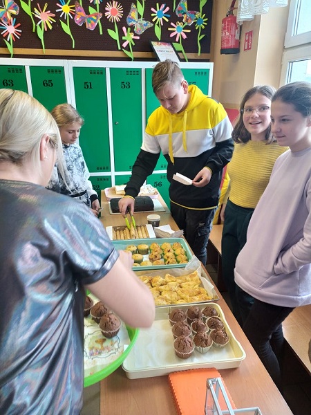 W trakcie zabaw na przerwach uczniowie udawali się na wcześniej przygotowany poczęstunek smakowitych wypieków- ciast, babeczek, rogalików. Dochód z ich sprzedaży zostanie przekazany na cel charytatywny – na rehabilitację i leczenie taty naszego młodszego kolegi. Pokazaliśmy, że życzliwość i pozytywna energia w naszej szkole nie są tylko pojęciami abstrakcyjnymi.