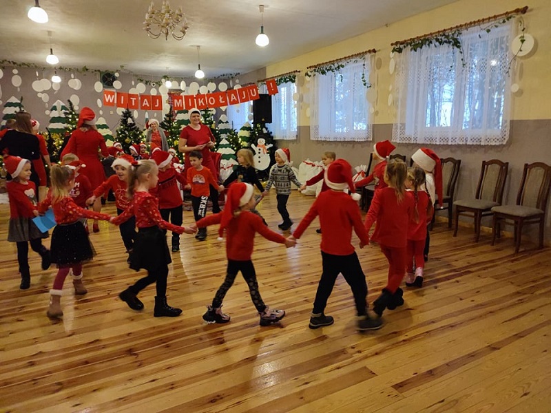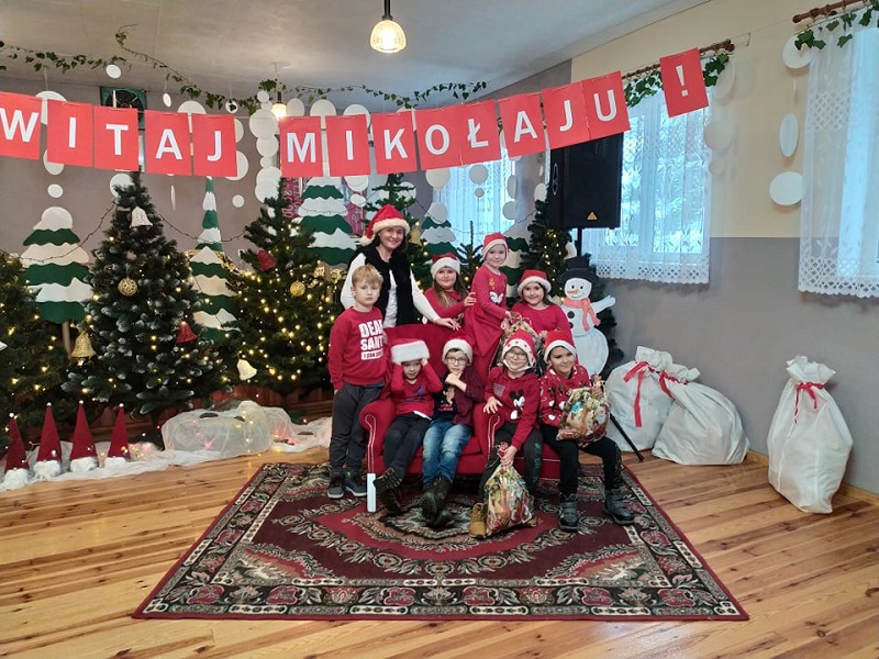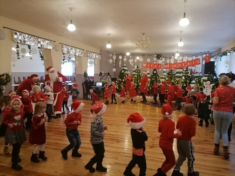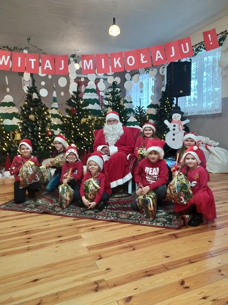 Święty Mikołaj nie zawiódł i w tym roku, nie kazał długo na siebie czekać. Nasz gość zaczął swoją wizytę od naszych najmłodszych – przedszkolaków, które wreszcie doczekały się wizyty upragnionego Mikołaja. Witały go z ogromnym entuzjazmem i radością. Wszystkie bardzo przeżywały to spotkanie. Wsród najmłodszej grupy na niejednej twarzy można było zobaczyć niepewność, obawę, a nawet lęk. Trwało to jednak krótko. Mikołaj wręczył każdemu dziecku wspaniały prezent i musiał się pożegnać, ponieważ czekały na niego jeszcze dzieci z klas starszych (1-8), którzy również w radosnej atmosferze spędzili czas z wyczekiwanym gościem. Były wspólne zabawy, śpiew – dużo radości.