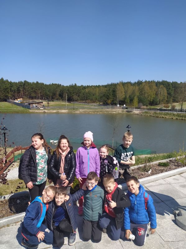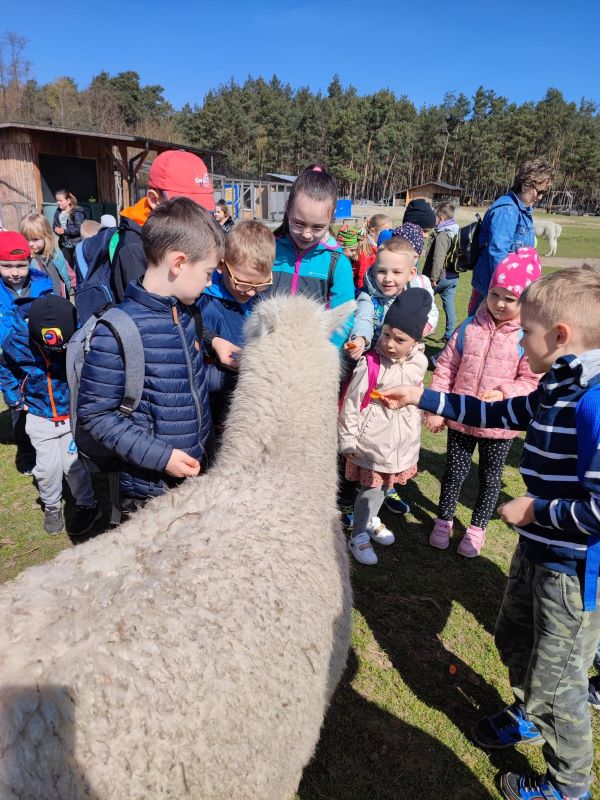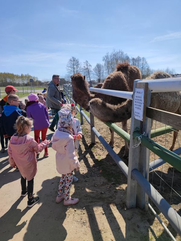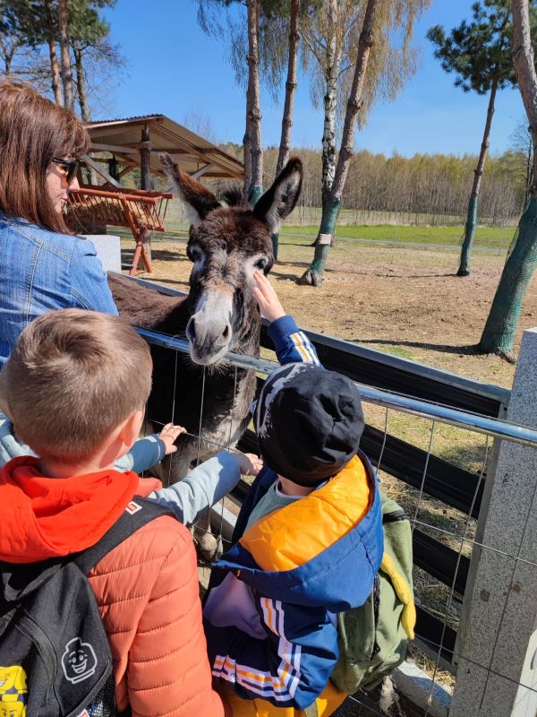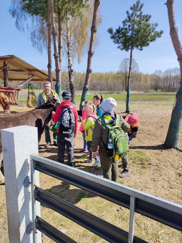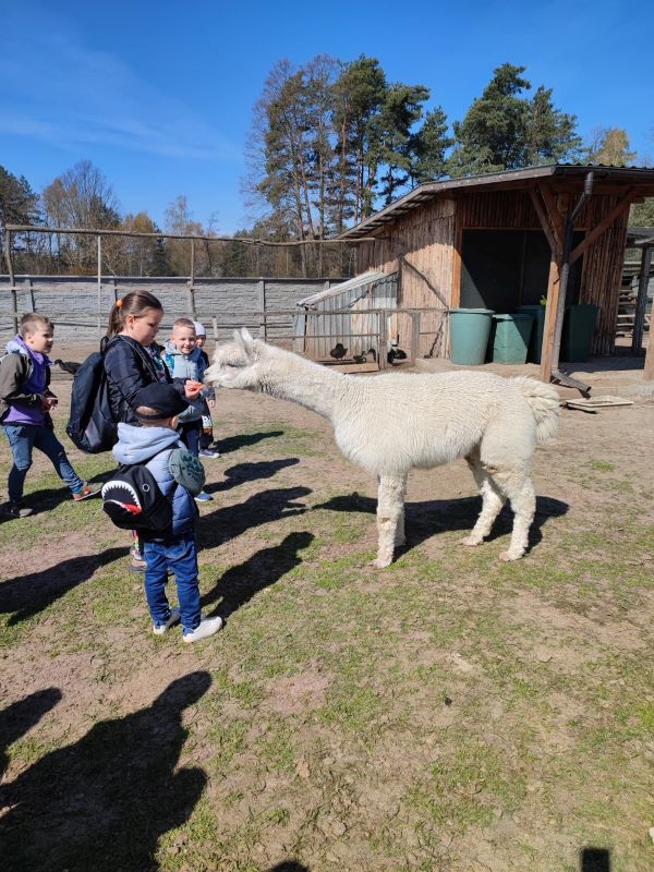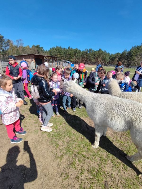 W piątkowy ranek przedszkolaki wraz z uczniami z klas I i III udały się na wycieczkę do agroturystyki „Pod Dębem” mieszczącej się w miejscowości Osowa. Był to wyjazd zwieńczający obchody Dnia Ziemi przełożony z poprzedniego tygodnia z powodu niesprzyjającej pogody. Na szczęście w ten piątek pogoda dopisała. Już od rana humory uczestników sięgały zenitu 😊 Na miejscu na dzieci czekało wiele atrakcji. Zaczęliśmy od poznawania przyjaznych dla ludzi „mieszkańców” tego miejsca- alpaki, wielbłądy, osły, strusie, łabędzie - które mogły same karmić, jak również głaskać i przytulać. Dzieci wzbogaciły swoją wiedzę na temat ich pochodzenia, hodowli i pielęgnacji. Po tylu wrażeniach i wiadomościach oraz wzmożonego apetytu wszyscy posilili się frytkami, które sprezentowała nasza Rada Rodziców. Z pełnymi brzuchami i nową energią ruszyliśmy dalej. W pobliżu obiektu było wiele miejsc sprzyjających aktywności ruchowej – plac zabaw, trasa spacerowa podczas której można było podziwiać piękno naszej przyrody, jej różnorodność. Wszystko w otoczeniu lasu, ciszy i spokoju. Na zakończenie odbył się piknik połączony z grami i zabawami, pamiętając, aby w trosce o naszą planetę zostawić po sobie porządek. Dzieci zmęczone, pełne wrażań, ale z uśmiechem na twarzy wróciły do szkoły.