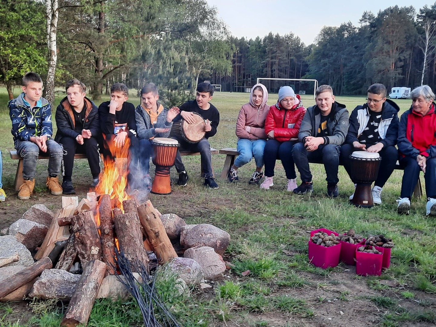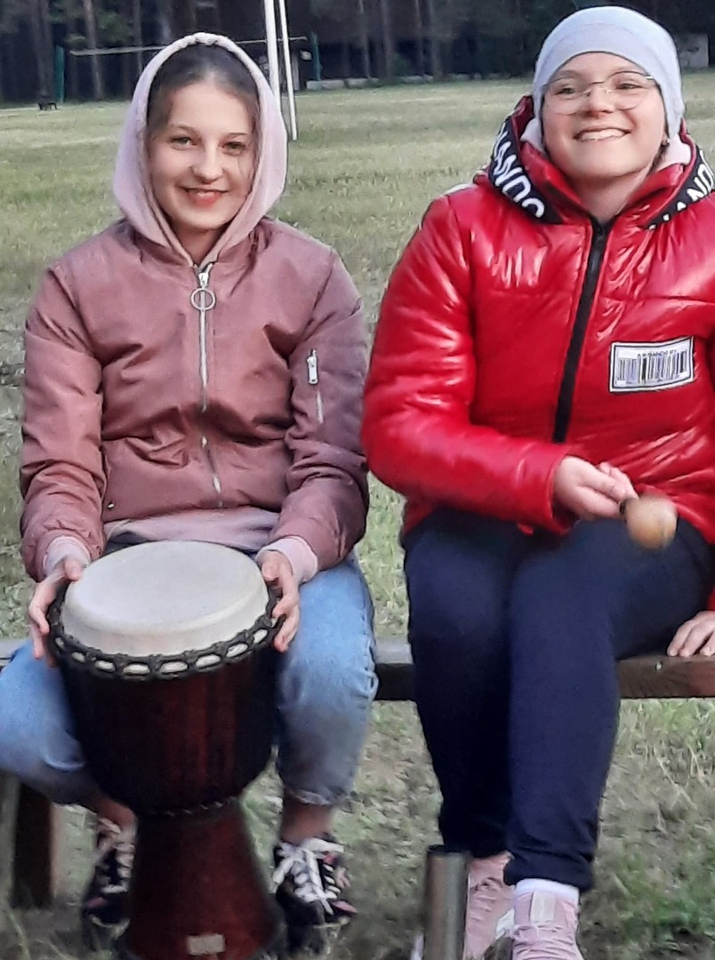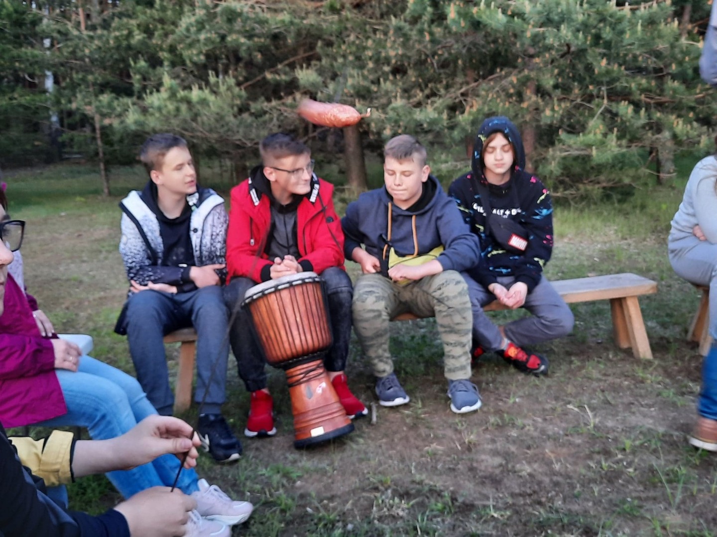 W poniedziałek spędziliśmy czas biorąc udział w zabawach integracyjnych, w warsztatach ekologiczno-plastyczno-rozwojowych, grach na świeżym powietrzu. Jedna z pań seniorek, pani Krysia, podzieliła się z nami swoją wiedzą na temat ziół, sposobów ich przetwarzania i stosowania, tak by nam nie szkodziły a pomagały. Wieczorem wszyscy zgromadziliśmy się przy ognisku. Pan Marek zaprezentował nam kilka rodzajów instrumentów perkusyjnych, m.in. bębny djembe, marakasy, Shekere-grzechoty z suchej i pustej tykwy owiniętej siateczką z nawleczonymi nasionami kakaowca, shakery oraz inne grzechotki. Wspólnie daliśmy niezły koncert. Jak ognisko, to było i pieczenie kiełbasek i chleba. Wszyscy zajadali się ze smakiem.
