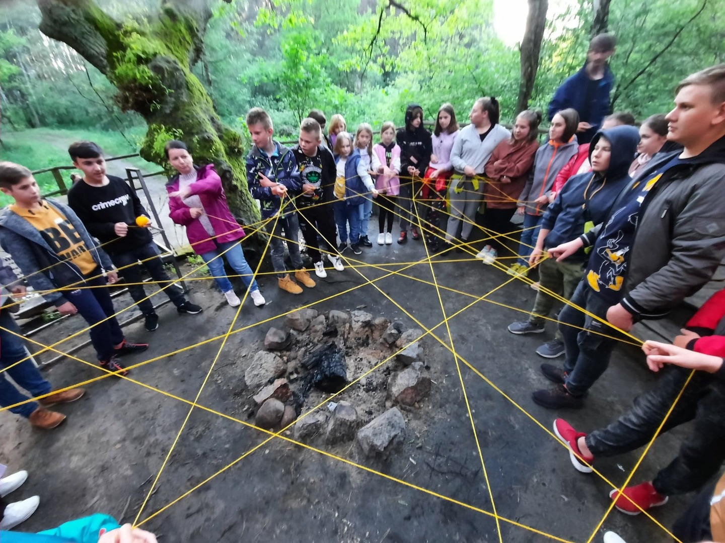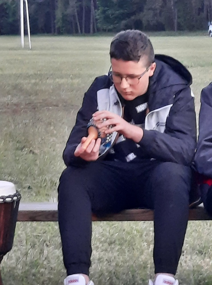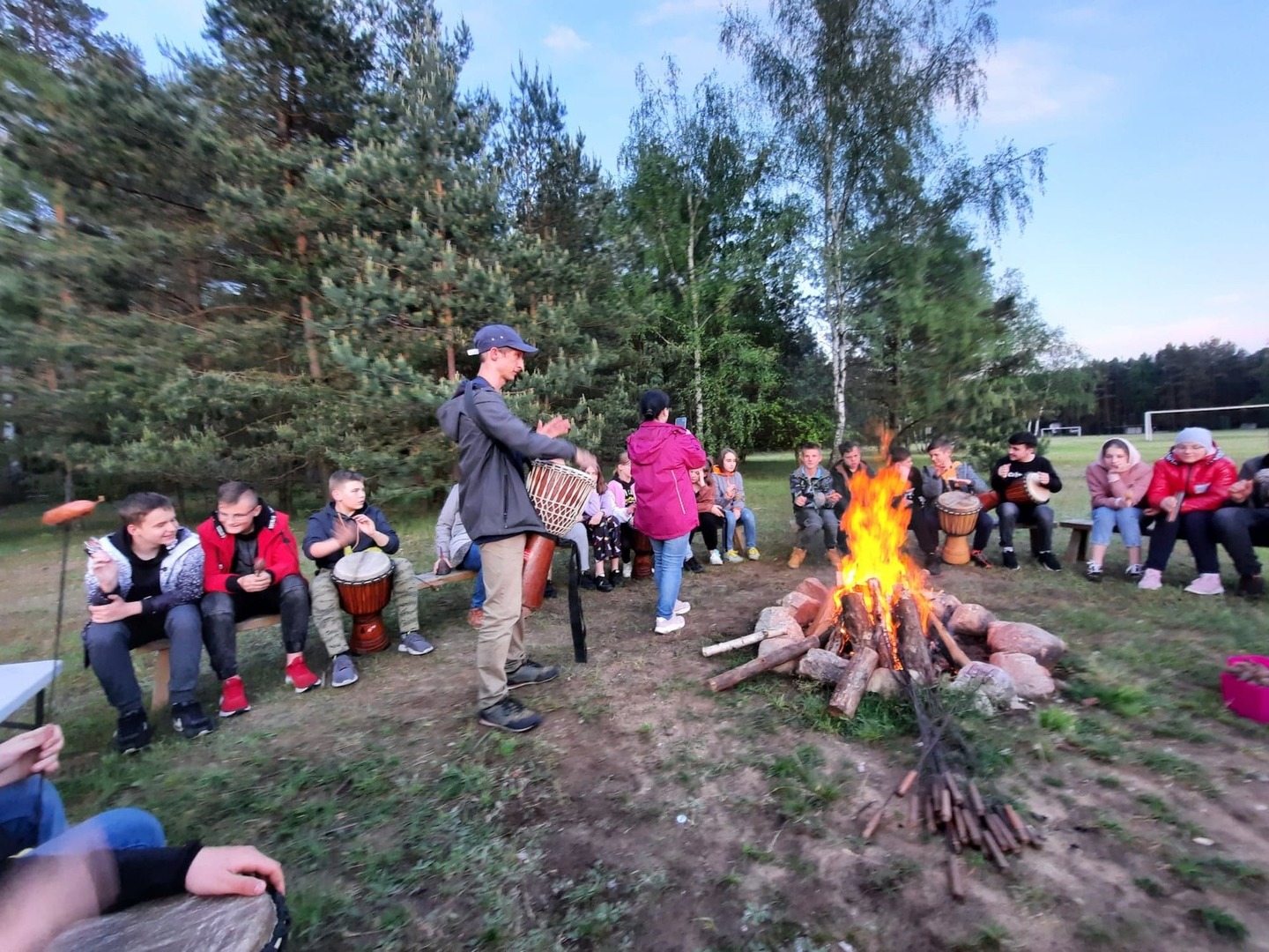 W poniedziałek spędziliśmy czas biorąc udział w zabawach integracyjnych, w warsztatach ekologiczno-plastyczno-rozwojowych, grach na świeżym powietrzu. Jedna z pań seniorek, pani Krysia, podzieliła się z nami swoją wiedzą na temat ziół, sposobów ich przetwarzania i stosowania, tak by nam nie szkodziły a pomagały. Wieczorem wszyscy zgromadziliśmy się przy ognisku. Pan Marek zaprezentował nam kilka rodzajów instrumentów perkusyjnych, m.in. bębny djembe, marakasy, Shekere-grzechoty z suchej i pustej tykwy owiniętej siateczką z nawleczonymi nasionami kakaowca, shakery oraz inne grzechotki. Wspólnie daliśmy niezły koncert. Jak ognisko, to było i pieczenie kiełbasek i chleba. Wszyscy zajadali się ze smakiem.