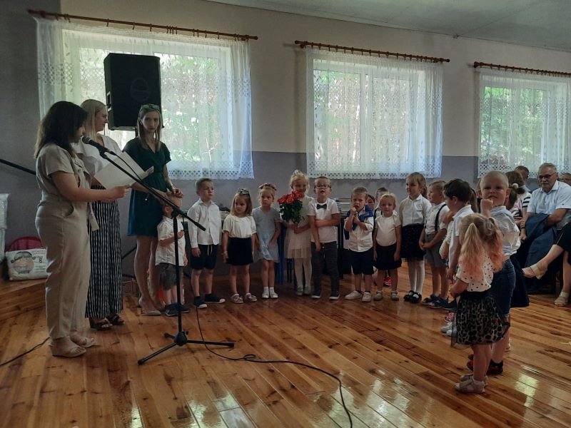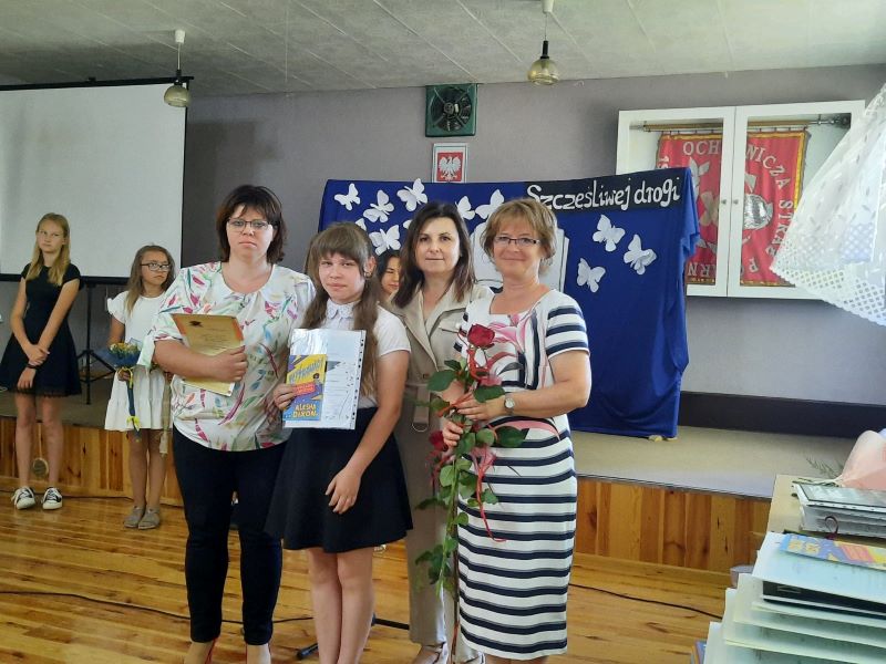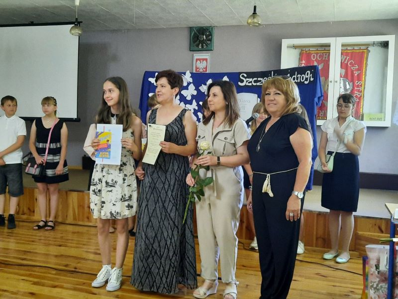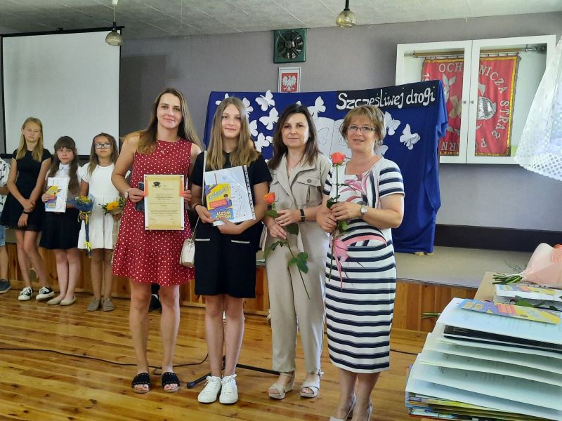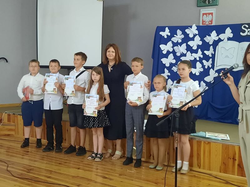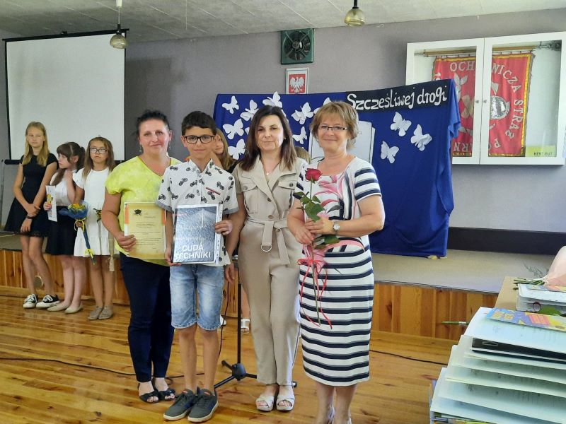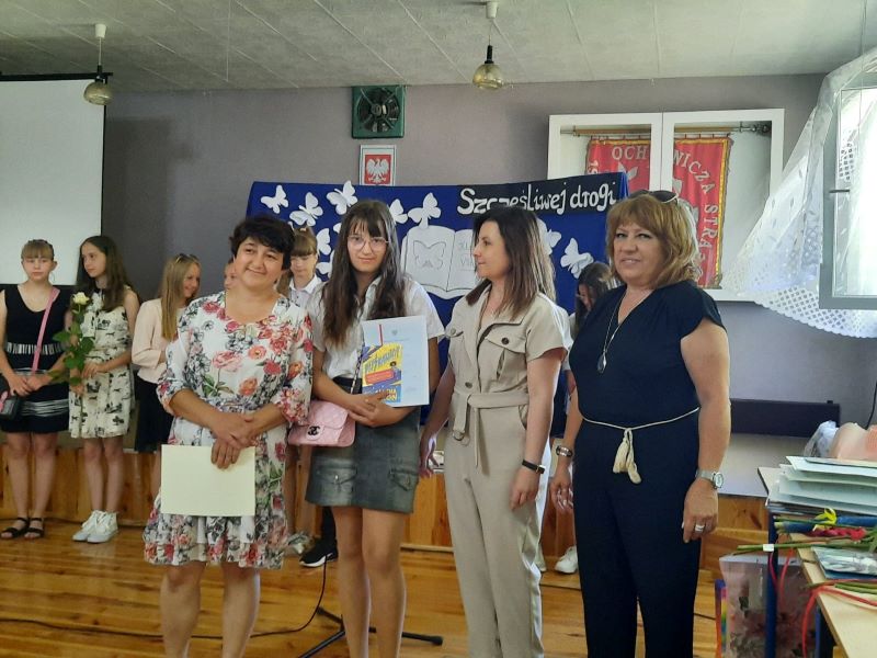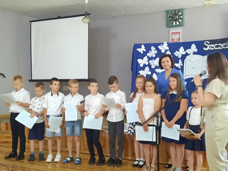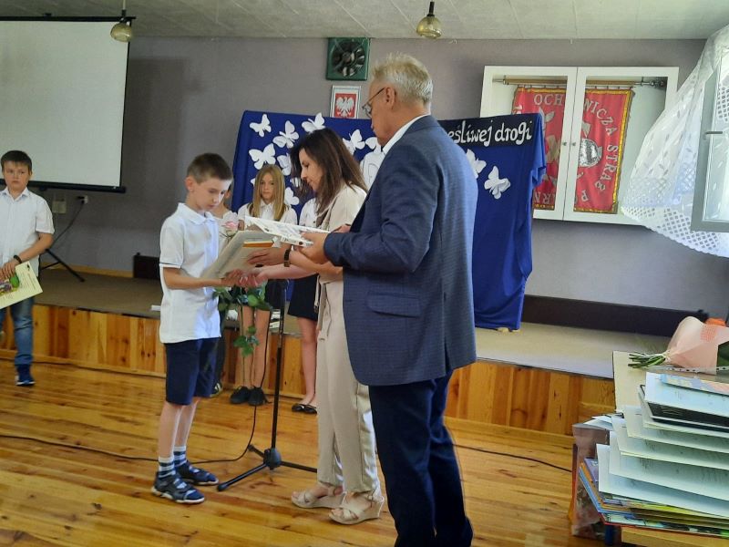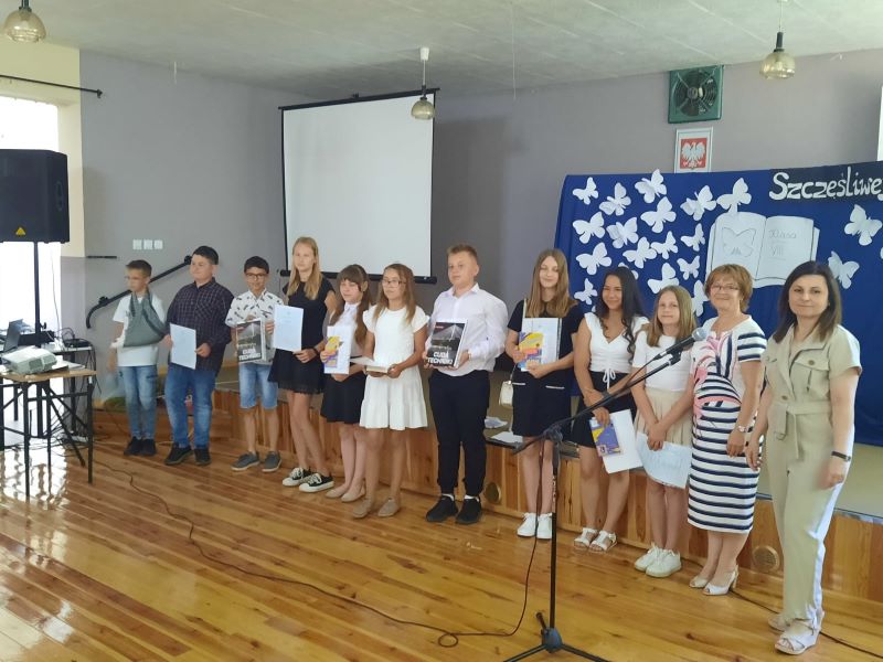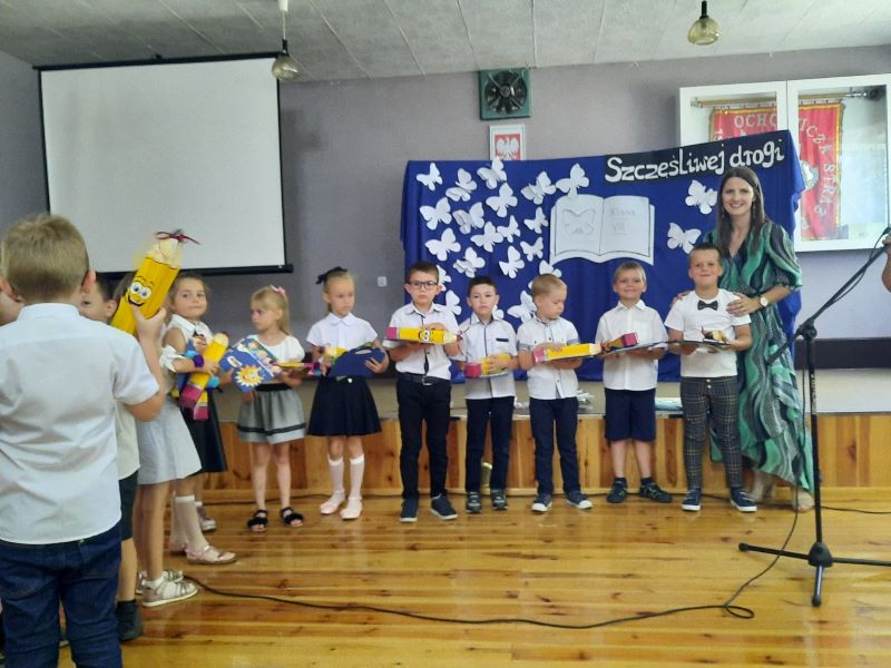 W piątek, 24.06.2022 r., cała społeczność szkolna zgromadziła się na Sali OSP w Teklinowie. Po powitaniu zebranych dyrektor szkoły Anna Jakubowska krótko podsumowała mijający rok szkolny dziękując wszystkim za pracę i zaangażowanie. Wraz z radnym gminnym p. Jarosławem Dębskim oraz prezesem tutejszej OSP p. Zbigniewem Gąszczakiem wręczyła Nagrodę Burmistrza Wieruszowa najlepszej absolwentce Dominice Przysiewek oraz przekazała gratulacje dla jej rodziców. Pani dyrektor wręczyła również Nagrodę Dyrektora Szkoły oraz Nagrody Rady Pedagogicznej. Wręczono także świadectwa z wyróżnieniem i nagrody książkowe jak również karty rowerowe, a najmłodszym pamiątkowe dyplomy i słodkie upominki zafundowane przez rodziców. Wszyscy uczniowie otrzymali świadectwa promujące ich do kolejnych klas. Wszyscy uczniowie najstarszej klasy, klasy ósmej, uroczyście otrzymali świadectwa ukończenia szkoły podstawowej. Przedstawicielki Rady Rodziców na ręce pani dyrektor, symbolicznym bukietem kwiatów podziękowały za współpracę w minionym roku szkolnym i życzyły wszystkim zasłużonego odpoczynku.