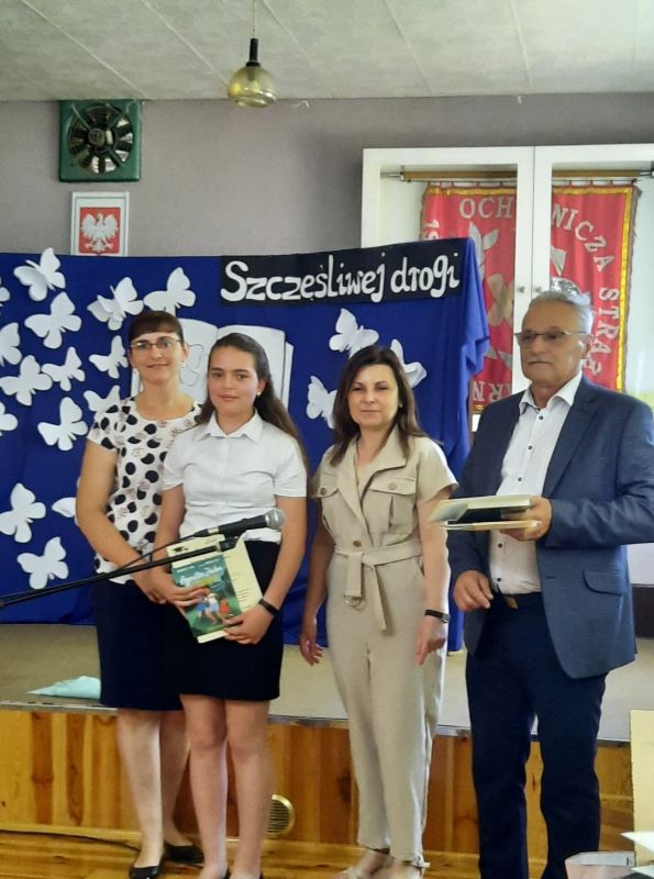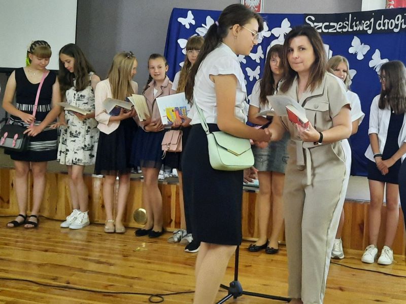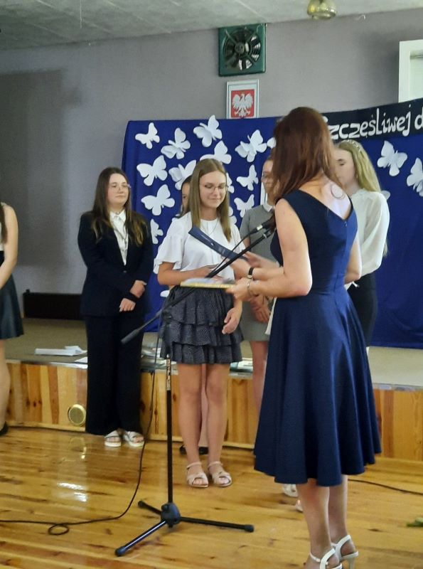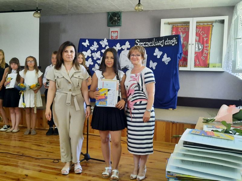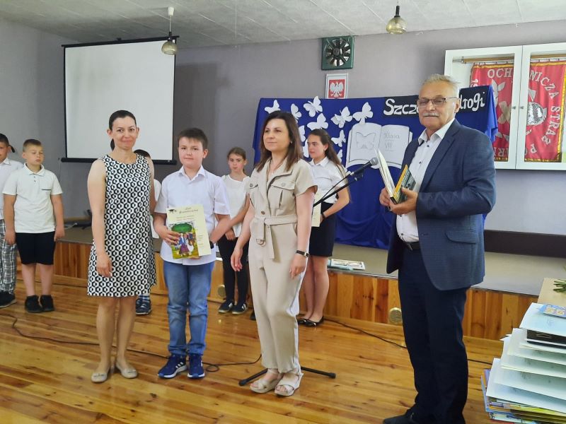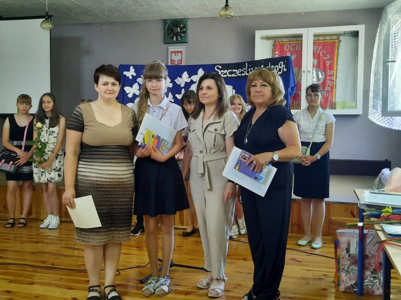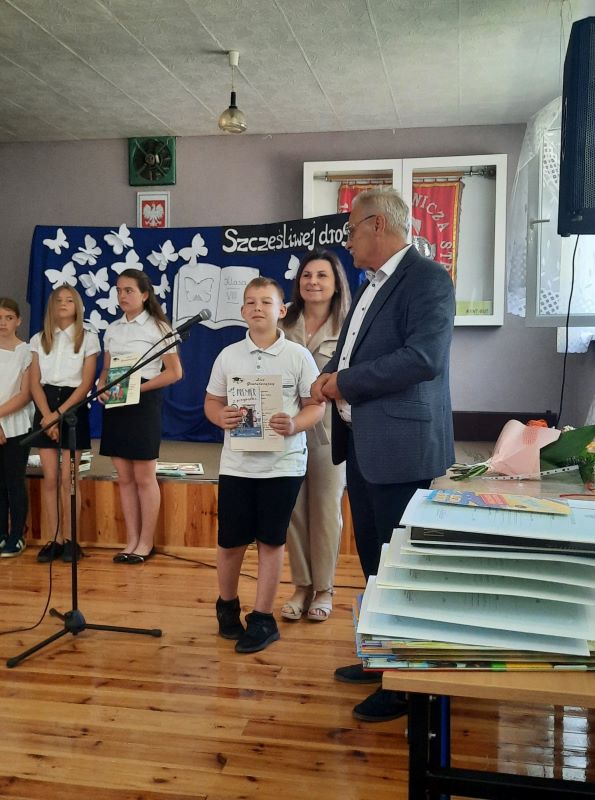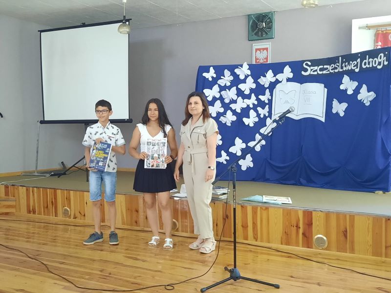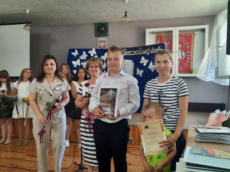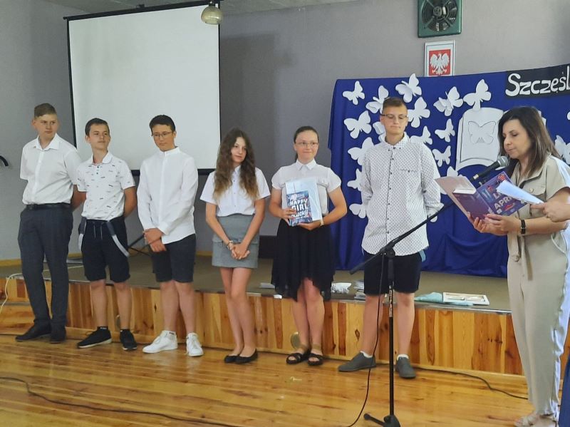 W piątek, 24.06.2022 r., cała społeczność szkolna zgromadziła się na Sali OSP w Teklinowie. Po powitaniu zebranych dyrektor szkoły Anna Jakubowska krótko podsumowała mijający rok szkolny dziękując wszystkim za pracę i zaangażowanie. Wraz z radnym gminnym p. Jarosławem Dębskim oraz prezesem tutejszej OSP p. Zbigniewem Gąszczakiem wręczyła Nagrodę Burmistrza Wieruszowa najlepszej absolwentce Dominice Przysiewek oraz przekazała gratulacje dla jej rodziców. Pani dyrektor wręczyła również Nagrodę Dyrektora Szkoły oraz Nagrody Rady Pedagogicznej. Wręczono także świadectwa z wyróżnieniem i nagrody książkowe jak również karty rowerowe, a najmłodszym pamiątkowe dyplomy i słodkie upominki zafundowane przez rodziców. Wszyscy uczniowie otrzymali świadectwa promujące ich do kolejnych klas. Wszyscy uczniowie najstarszej klasy, klasy ósmej, uroczyście otrzymali świadectwa ukończenia szkoły podstawowej. Przedstawicielki Rady Rodziców na ręce pani dyrektor, symbolicznym bukietem kwiatów podziękowały za współpracę w minionym roku szkolnym i życzyły wszystkim zasłużonego odpoczynku.