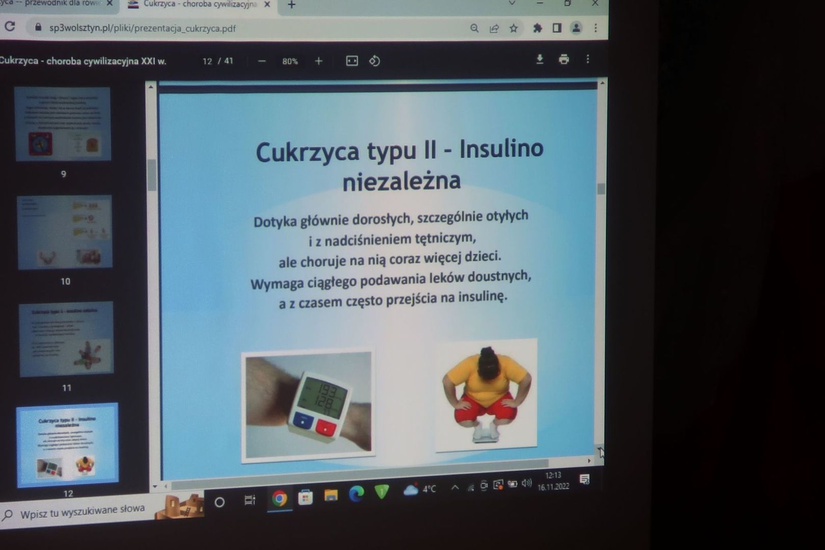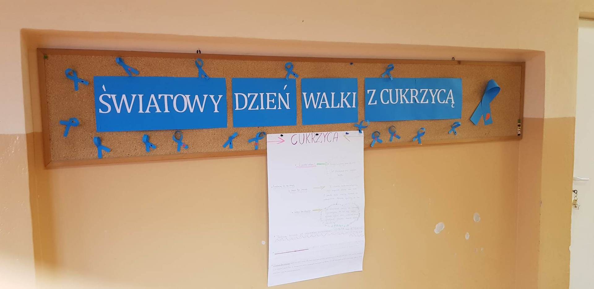 Z tej okazji 16 listopada w naszej szkole uczniowie wzięli udział w prelekcji dotyczącej zwiększenia świadomości przyczyn, objawów, sposobu leczenia i powikłań związanych z cukrzycą. Dzieci dowiedziały się, na czym polega cukrzyca typu 1 i 2 oraz jakie są jej objawy i sposoby leczenia, jak postępować w przypadkach wystąpienia objawów niedocukrzenia lub hiperglikemii u diabetyków. Uczniowie mieli również okazję sprawdzić swoją wiedzę z zakresu profilaktyki cukrzycy – rozwiązywali test,a młodsze klasy tworzyły symbol cukrzycy.