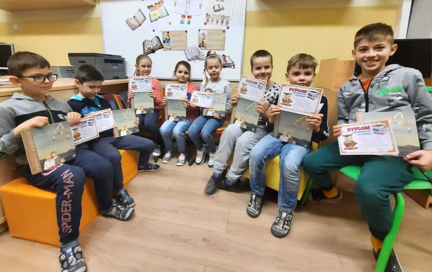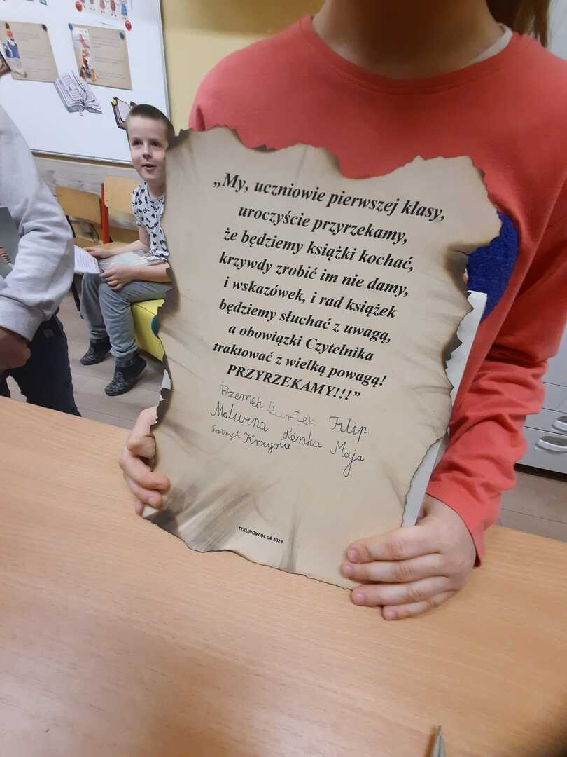 Książka to ważna dama. W kwietniu obchodzi swoje święta- 2 kwietnia akcentowany jest Międzynarodowy Dzień Książki dla Dzieci a 23 kwietnia Światowy Dzień Książki i Praw Autorskich.Z tych okazji pierwszoklasiści uroczyście zebrali się dziś w szkolnej bibliotece. Przypomnieli zasady dbania o książki oraz przeszli pomyślnie test- odczytali bezbłędnie cechy dobrego czytelnika i omówili je. Pierwszaki potrafią już samodzielnie wszystko przeczytać. Zatem nadszedł również czas aby przyjąć ich do grona szkolnych czytelników. Dzieci złożyły przyrzeczenie a także potwierdziły je swoimi podpisami. Na zakończenie spotkania otrzymały pamiątkowe dyplomy oraz Wyprawkę Czytelniczą w ramach ogólnopolskiej kampanii "Mała książka- wielki człowiek".