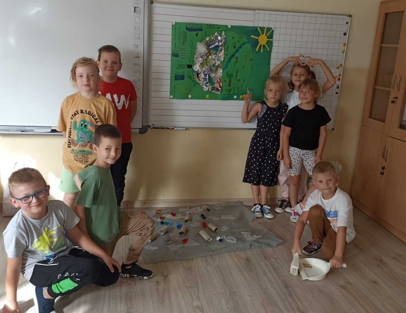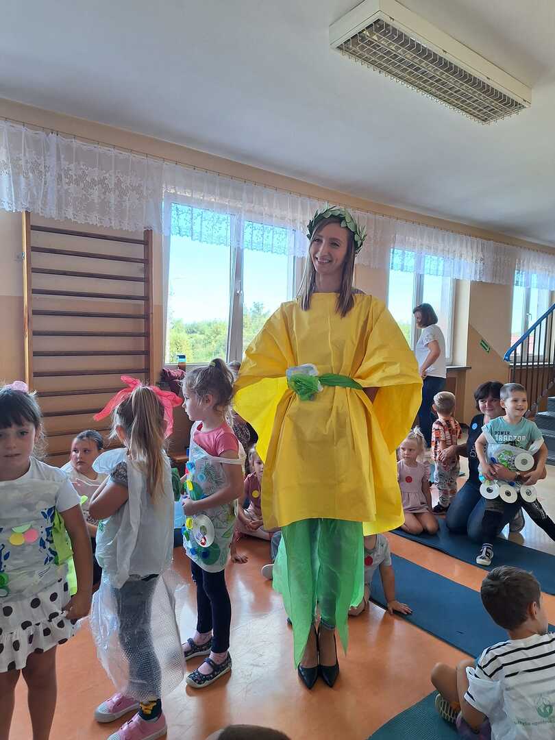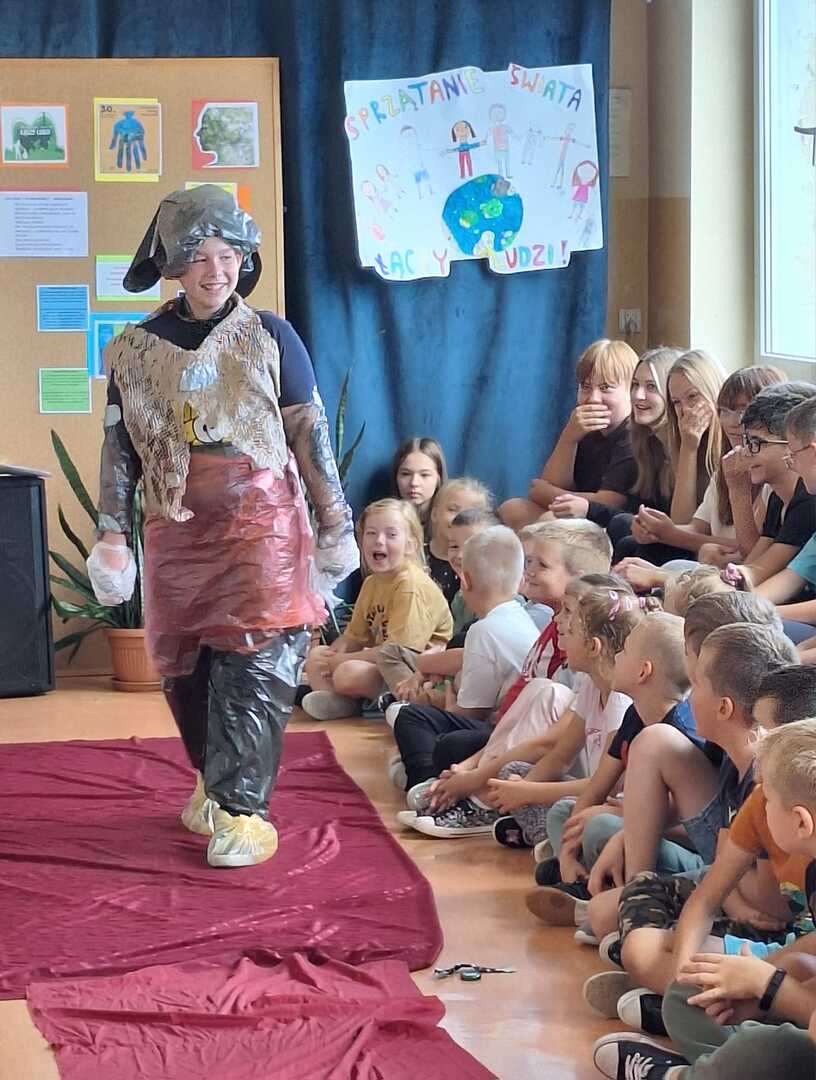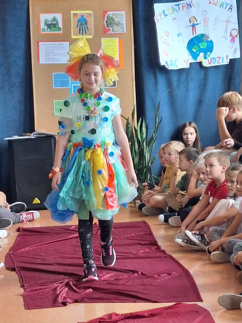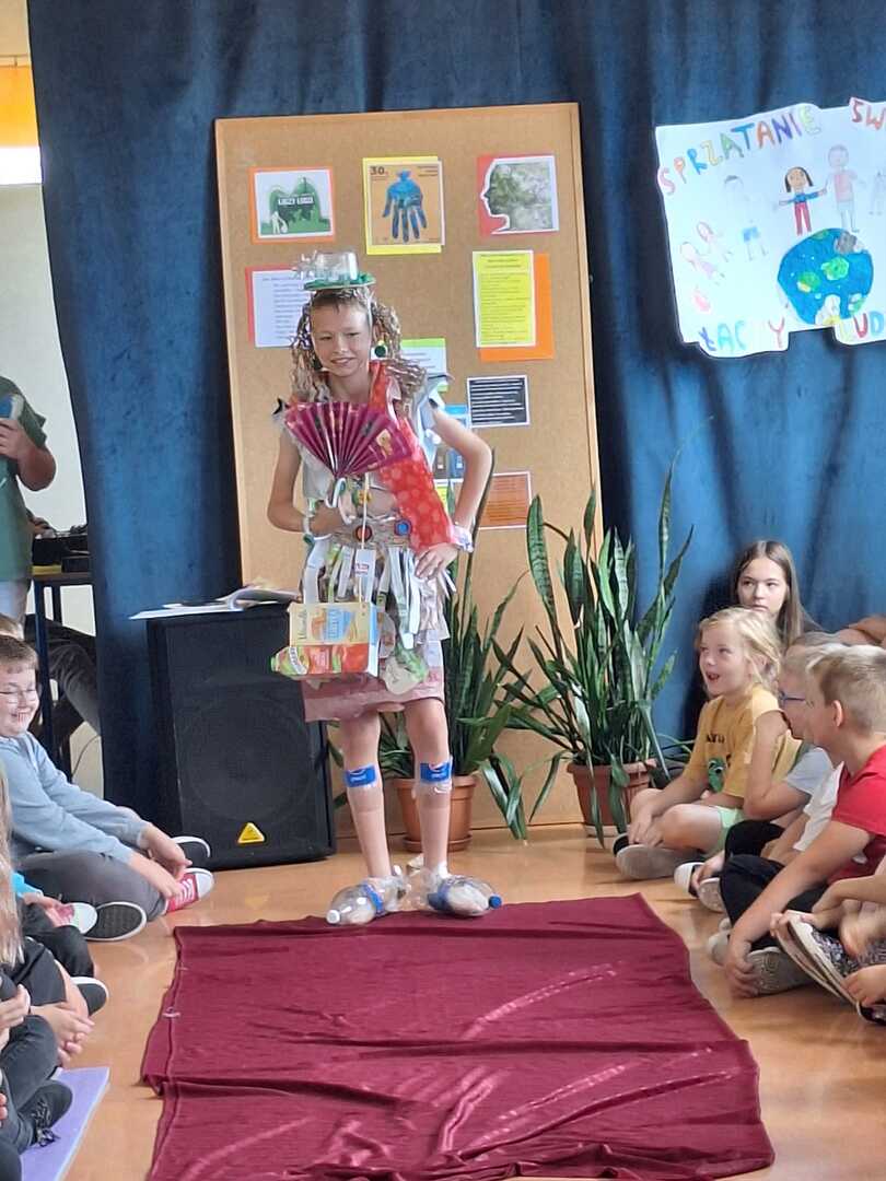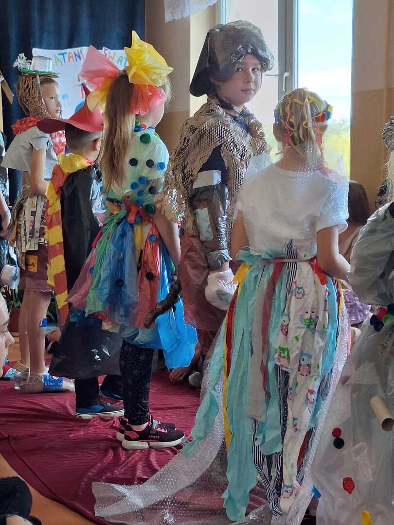 Dzisiaj wszyscy uczniowie i przedszkolaki podjęli działania, których celem było zadbanie o naszą planetę. Najpierw dzieci wykonały plakaty nawiązujące do akcji " Sprzatanie świata". Potem młodzi ekolodzy projektowali i wykonywali ubrania z materiałów, które najczęściej lądują w koszach na śmieci (m.in. papieru, plastikowych butelek, worków foliowych). Po prezentacji plakatów i strojów ekologicznych uczniowie przystąpili do porządkowanie otoczenia szkoły i pielęgnacji ogródka szkolnego.