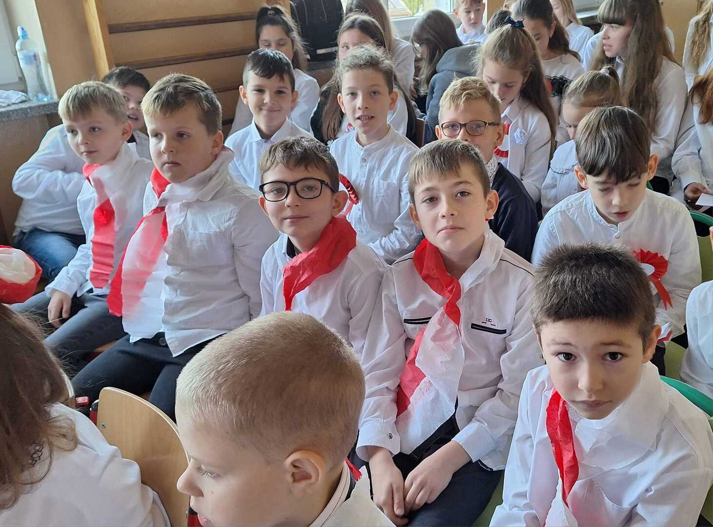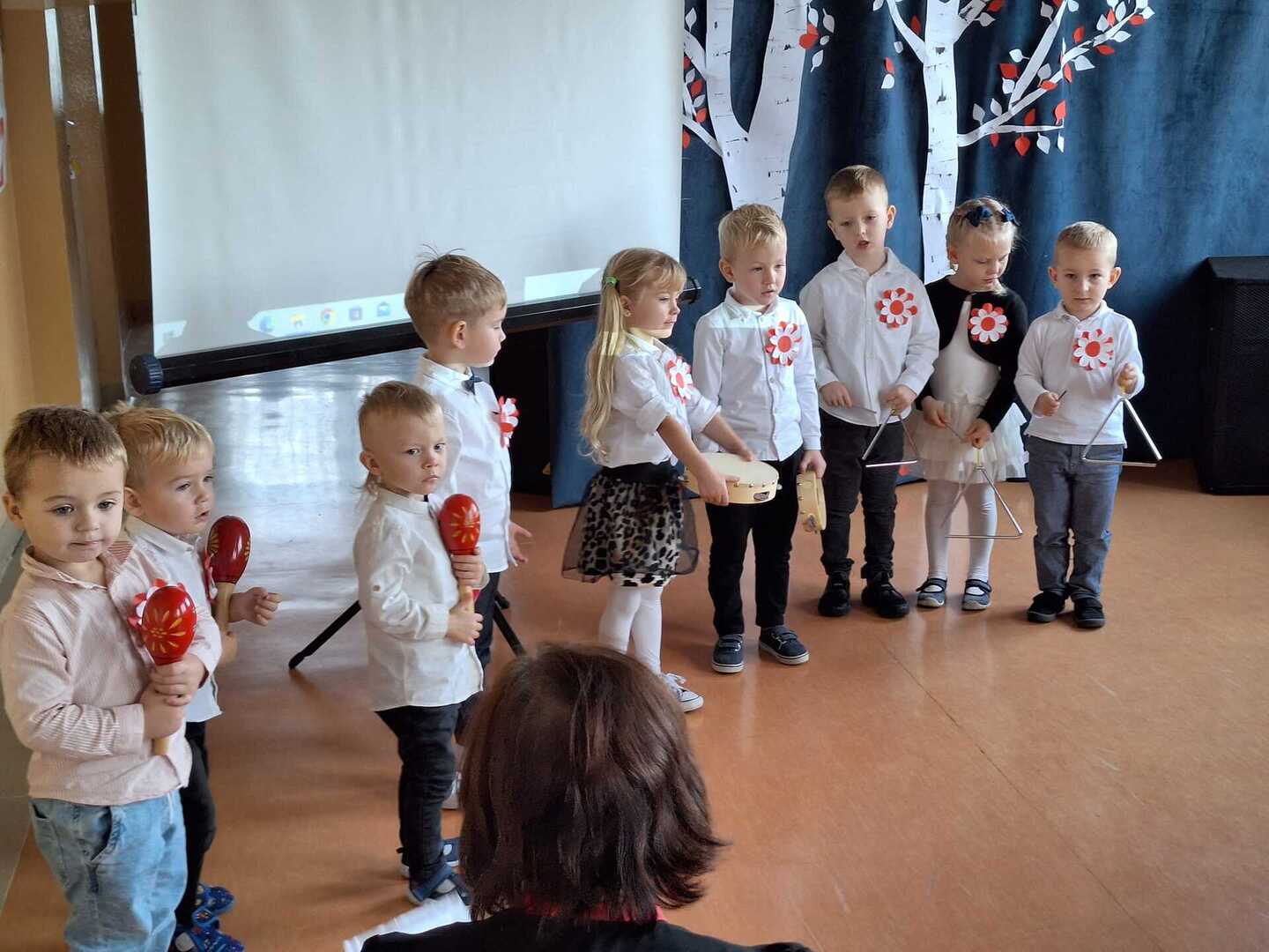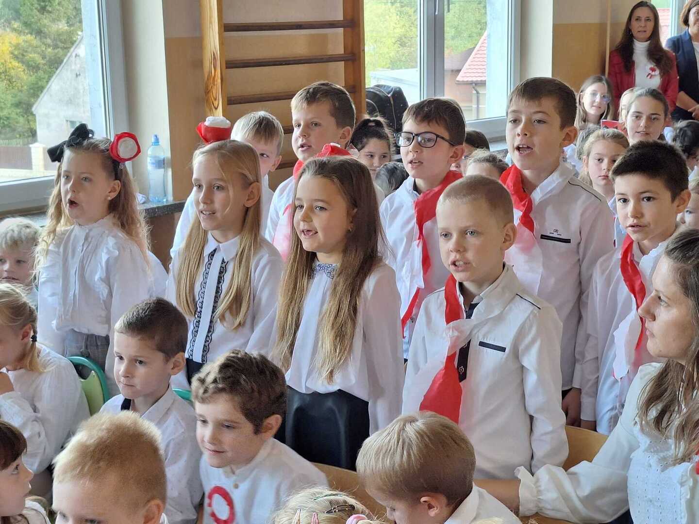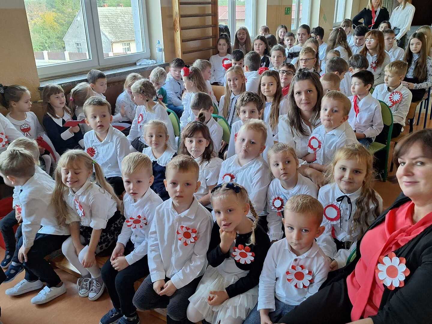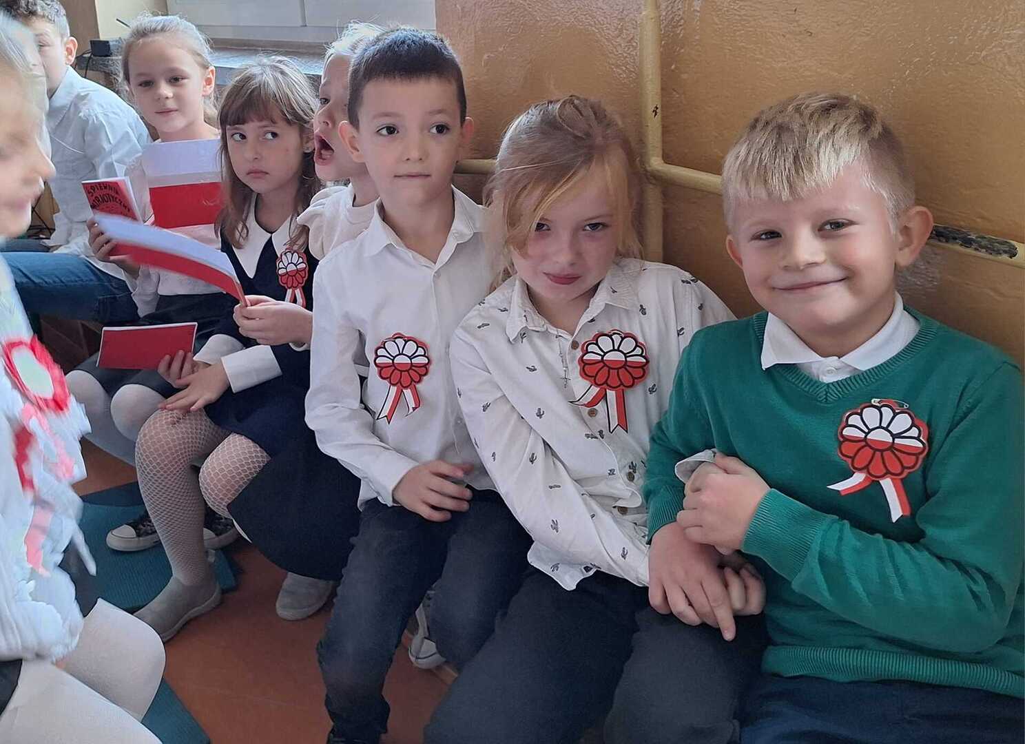 Dziś uroczyście zebraliśmy się wszyscy razem, by uczcić jutrzejsze wielkie święto narodowe - Święto Niepodległości. Zaśpiewaliśmy "Mazurka Dąbrowskiego" i wysłuchaliśmy kilku słów o historii Polski i Polaków. Następnie wzięliśmy udział w koncercie polskich pieśni patriotycznych - wszyscy byliśmy artystami. Na zakończenie wystąpili przed nami także nasi nauczyciele.