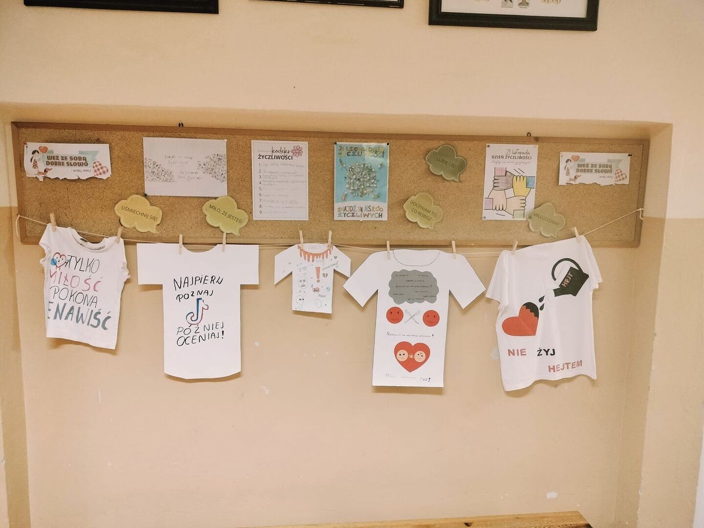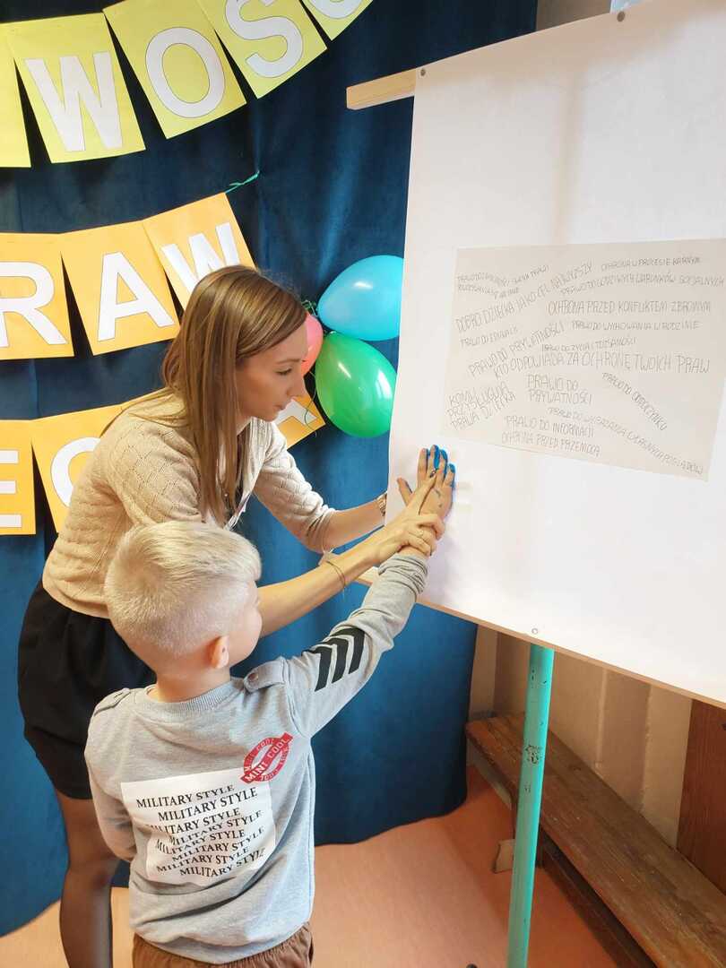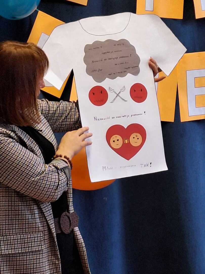 Klasy 1-3 udekorowały swoje sale gazetkami dotyczącymi życzliwości. Uczniowie klas 5-8 miały za zadanie zaprojektować koszulkę z logiem przeciwko mowie nienawiści. Wszystkie klasy stworzyły niesamowite projekty, które zaprezentowane zostały podczas spotkania na górnym korytarzu, następnie zostały odczytane na forum szkoły prawa dziecka i w symboliczny sposób po przez odbicie dłoni podpisane przez przedstawicieli poszczególnych klas.