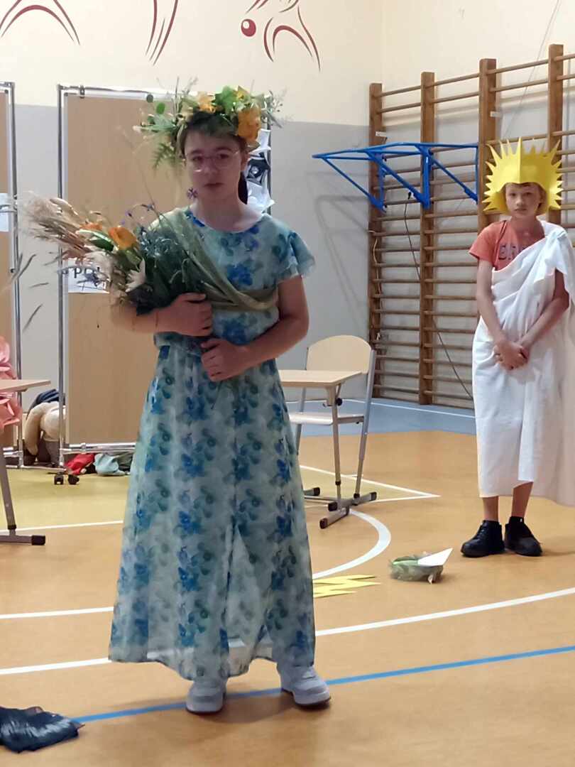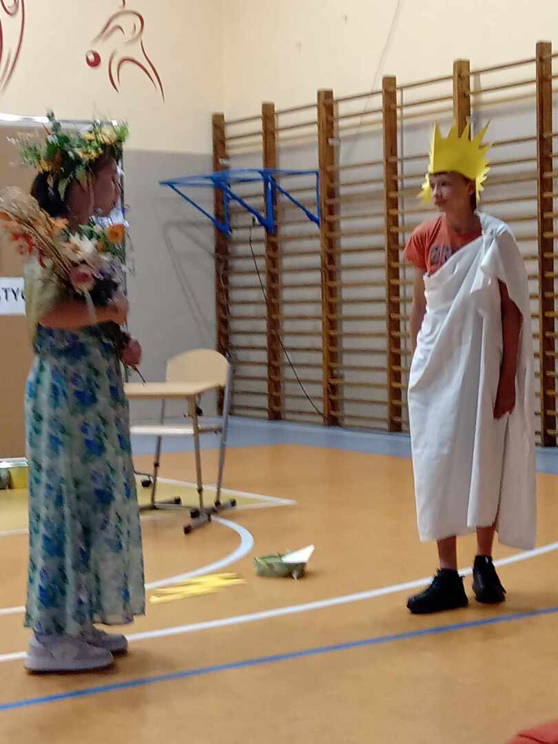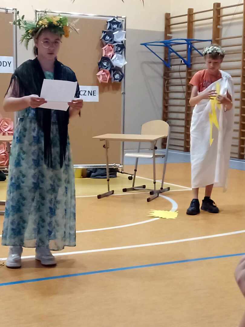 Zadaniem uczestników było wykonanie stacji zadaniowych, które musieli odnaleźć na podstawie wskazówek. Zadania zostały ukryte na terenie szkoły. PO wykonaniu zadań literacko- ortograficzno- gramatycznych zawodnicy przedstawiali scenkę dramatyczną. Uczniowie klasy 6 przygotowali scenkę na podstawie bajki I. Krasickiego „ Czapla, ryby i rak”, uczniowie klasy 5 zaprezentowali historię Demeter i Kory w oparciu o mit grecki.