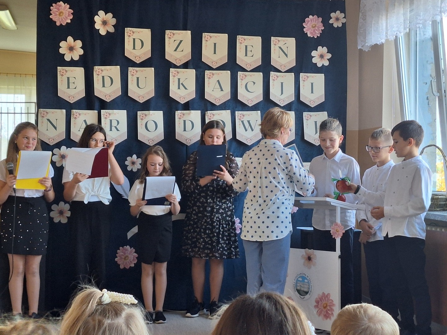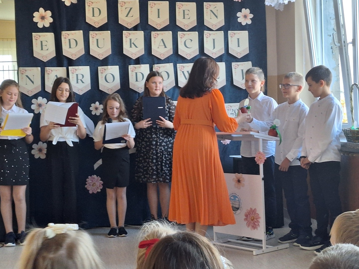 14 pażdziernika odbyła się wyjątkowa akademia z okazji przypadającego dziś święta – Dnia Edukacji Narodowej. Uroczystość rozpoczęła się od wystąpienia dyrektor szkoły Anny Jakubowskiej, która przywitała wszystkich nauczycieli, pracowników szkoły, zaproszonych nauczycieli emerytów oraz przedstawicieli rodziców. Po odśpiewaniu przez całą społeczność „Mazurka Dąbrowskiego”, pani dyrektor w uznaniu za osiągnięcia dydaktyczno-wychowawcze i rzetelną pracę przekazała Nagrodę Burmistrza Wieruszowa oraz wręczyła Nagrody Dyrektora Szkoły nauczycielom oraz pracownikom obsługi. Złożyła serdeczne życzenia i podziękowania, wszystkim byłym i obecnym, pedagogom i pracownikom szkoły. Życzenia, pełne miłych i ciepłych słów, z okazji Dnia Edukacji Narodowej przekazała także przewodnicząca Rady Rodziców oraz przedstawiciel Samorządu Uczniowskiego.