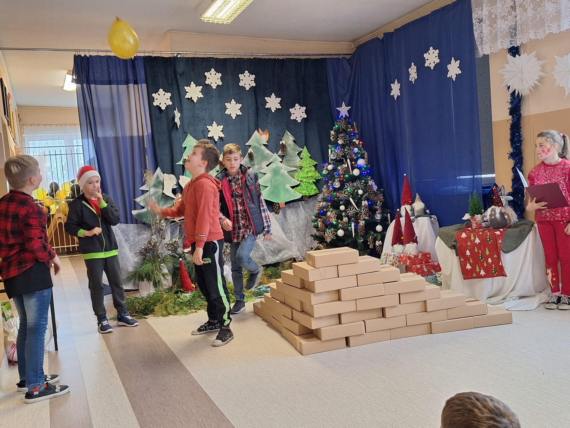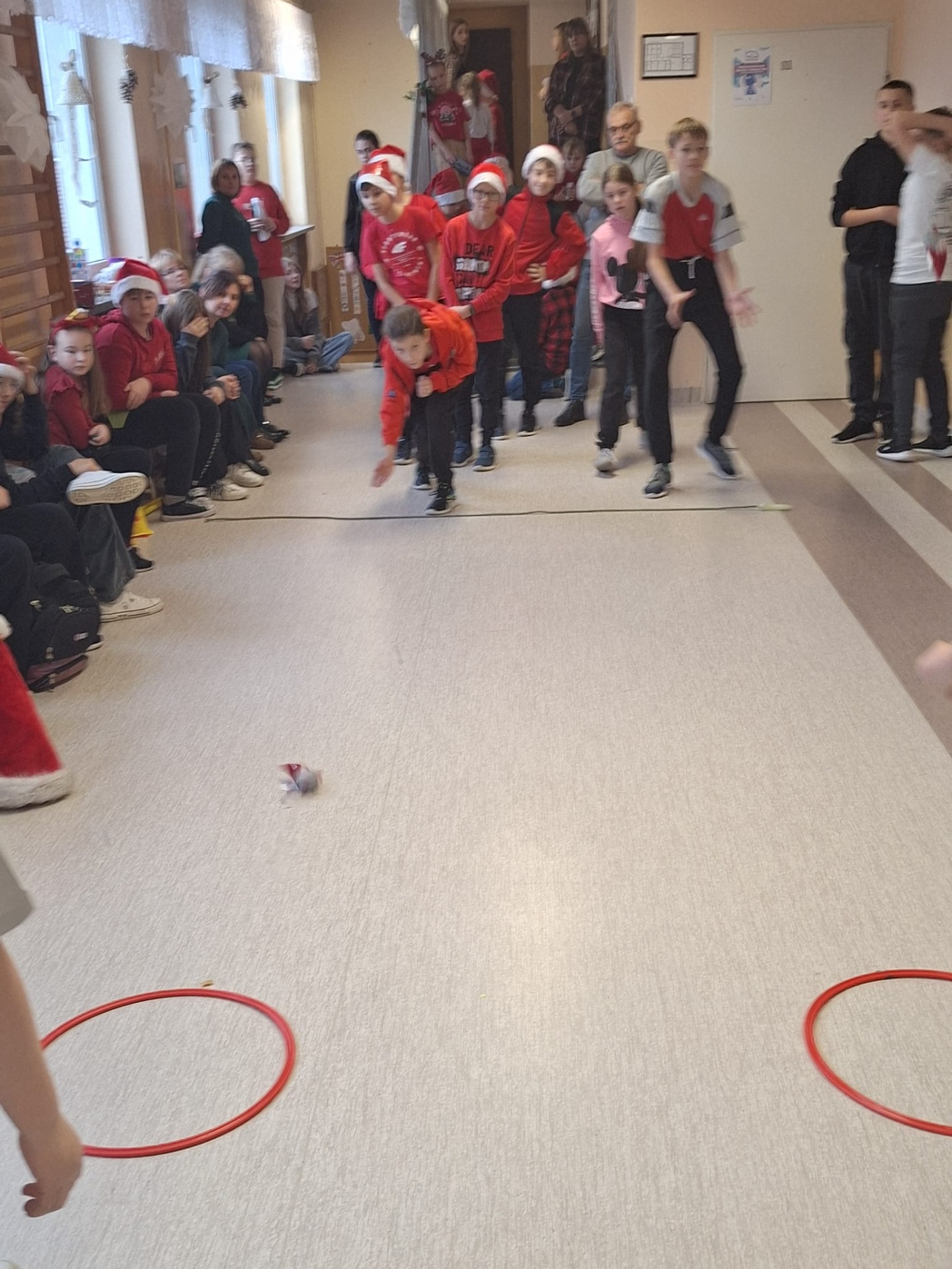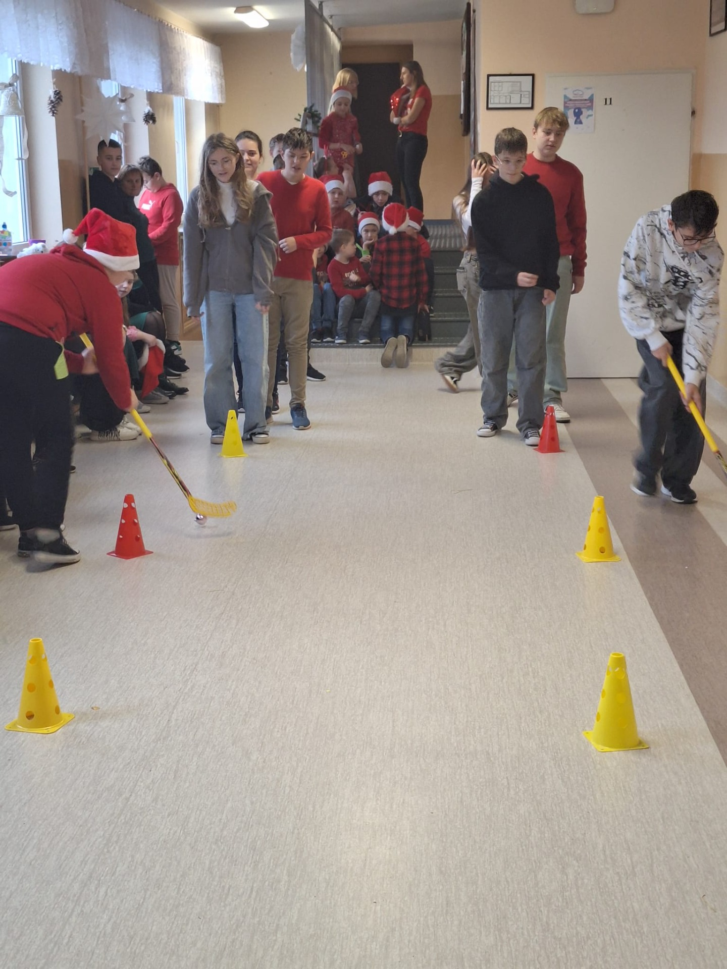 Po spotkaniu z Mikołajem uczniowie wzięli udział w 'Mikołajkowym Turnieju', uczestnicząc w różnych konkurencjach przygotowanych przez Samorząd Uczniowski wraz z opiekunem.