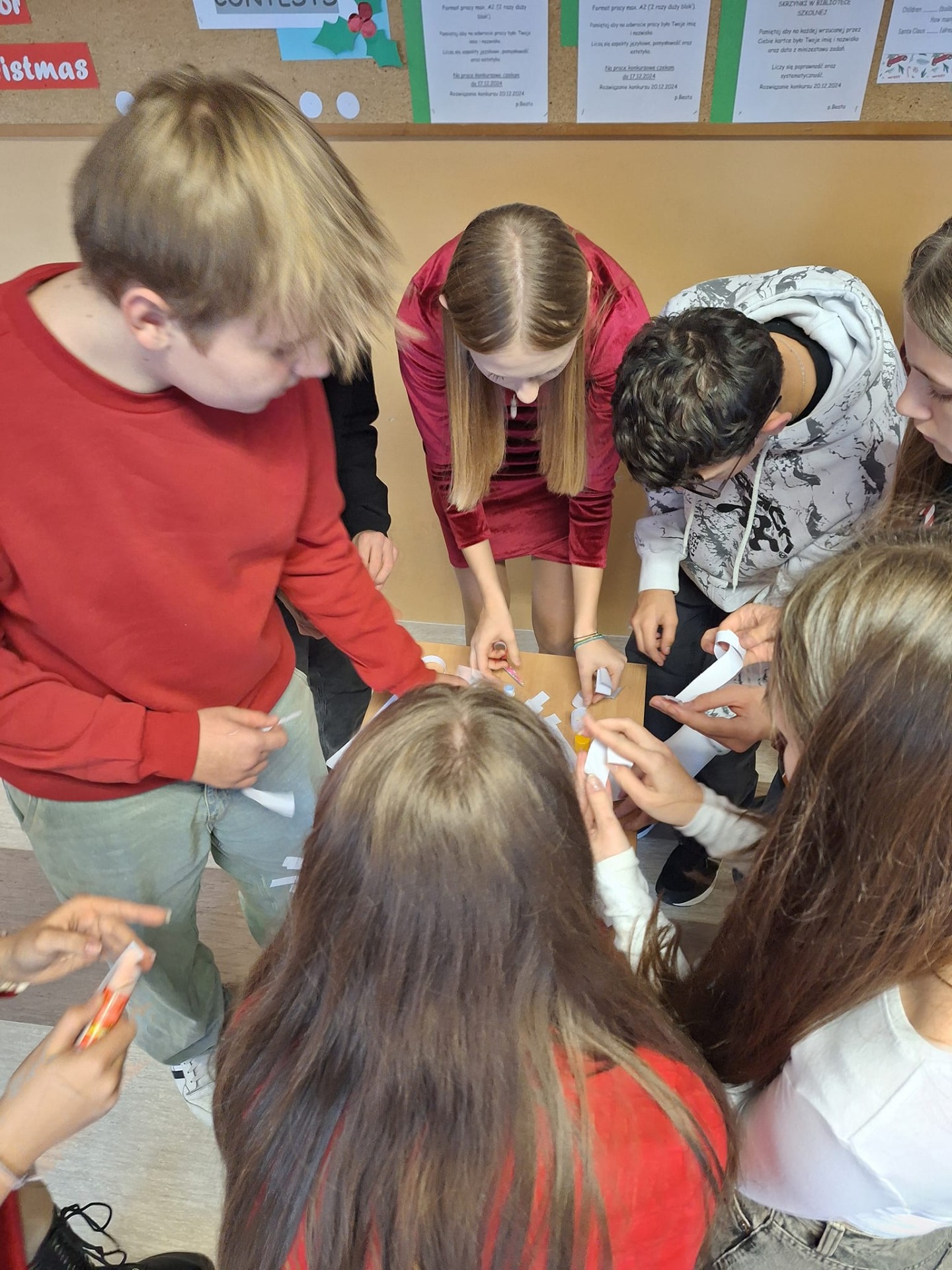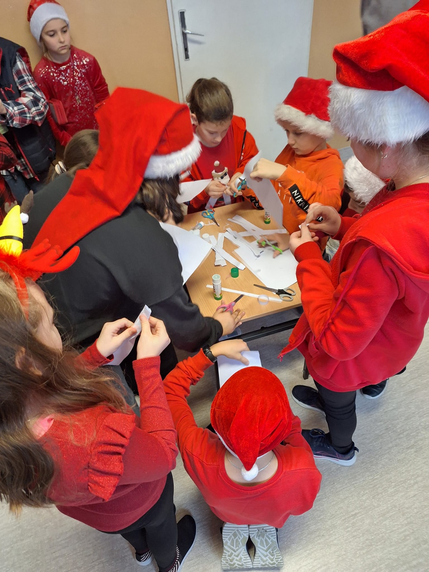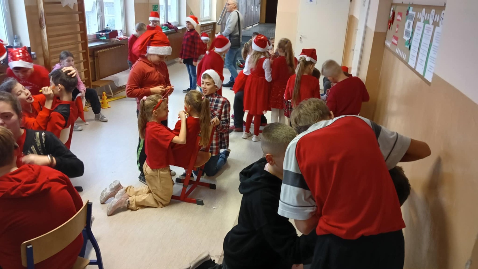 Po spotkaniu z Mikołajem uczniowie wzięli udział w 'Mikołajkowym Turnieju', uczestnicząc w różnych konkurencjach przygotowanych przez Samorząd Uczniowski wraz z opiekunem.