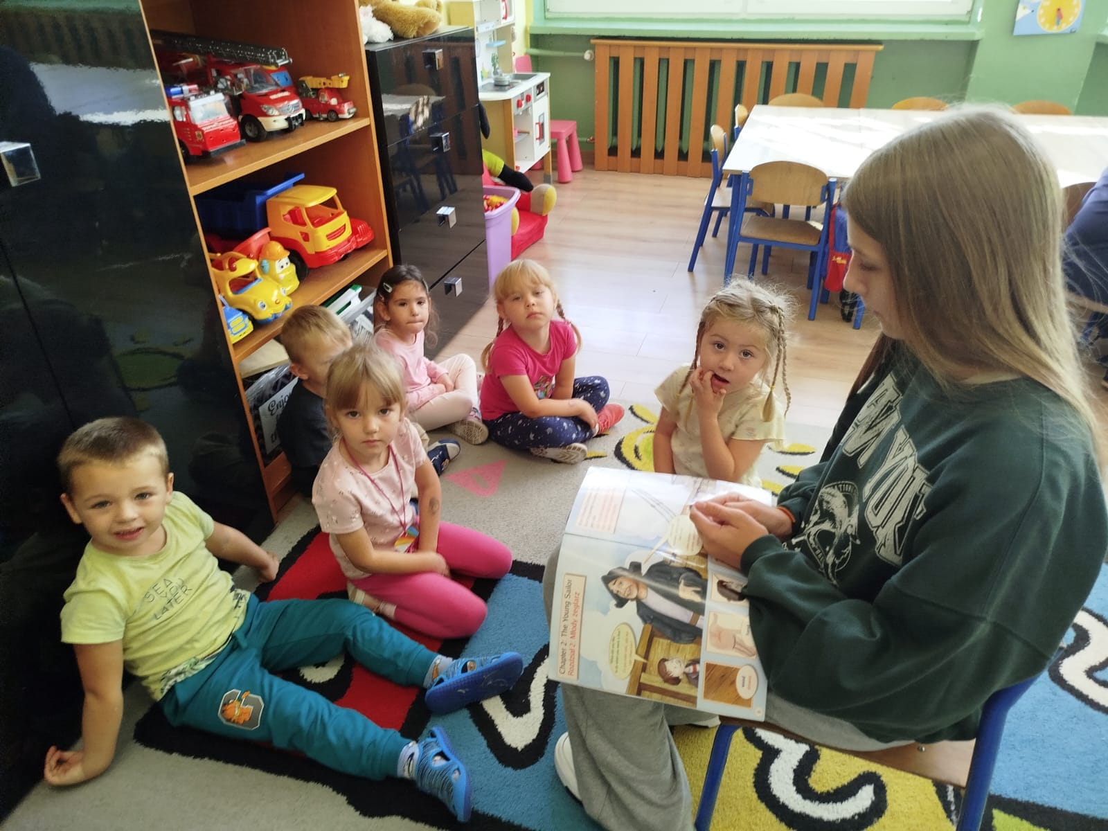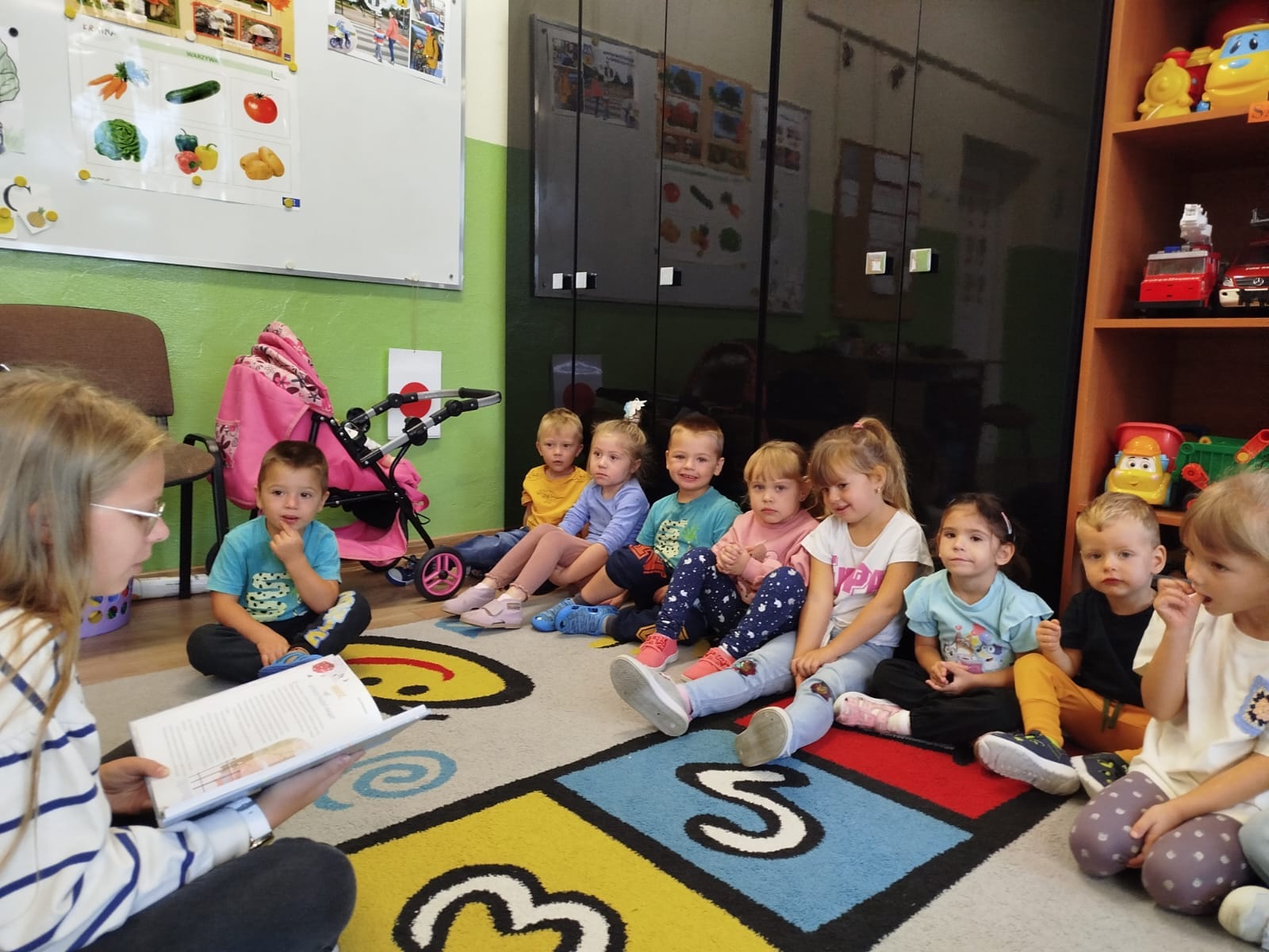 Grupa starsza regularnie odwiedza bibliotekę szkolną i dzieci wypożyczają książki do wspólnego czytania z rodzicami w domu. Maluszki też powoli stają się jej użytkownikami.