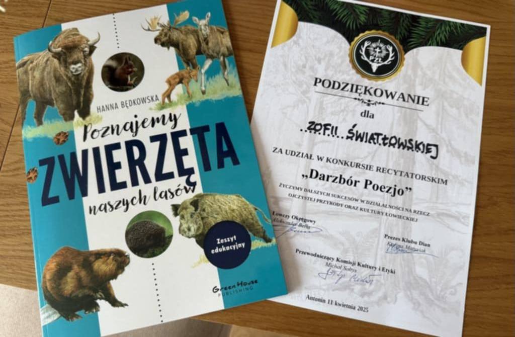 Uczennica kl.4, Zosia, 11-ego kwietnia uczestniczyła w konkursie recytatorskim "Darzbór poezjo!" zorganizowanym przez Zarząd Okręgowy Polskiego Związku Łowieckiego w Kaliszu. Konkurs odbył się w siedzibie Nadleśnictwa Antonin.