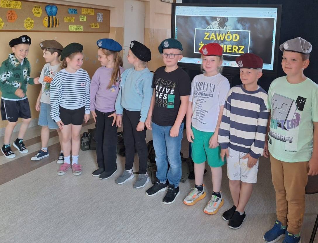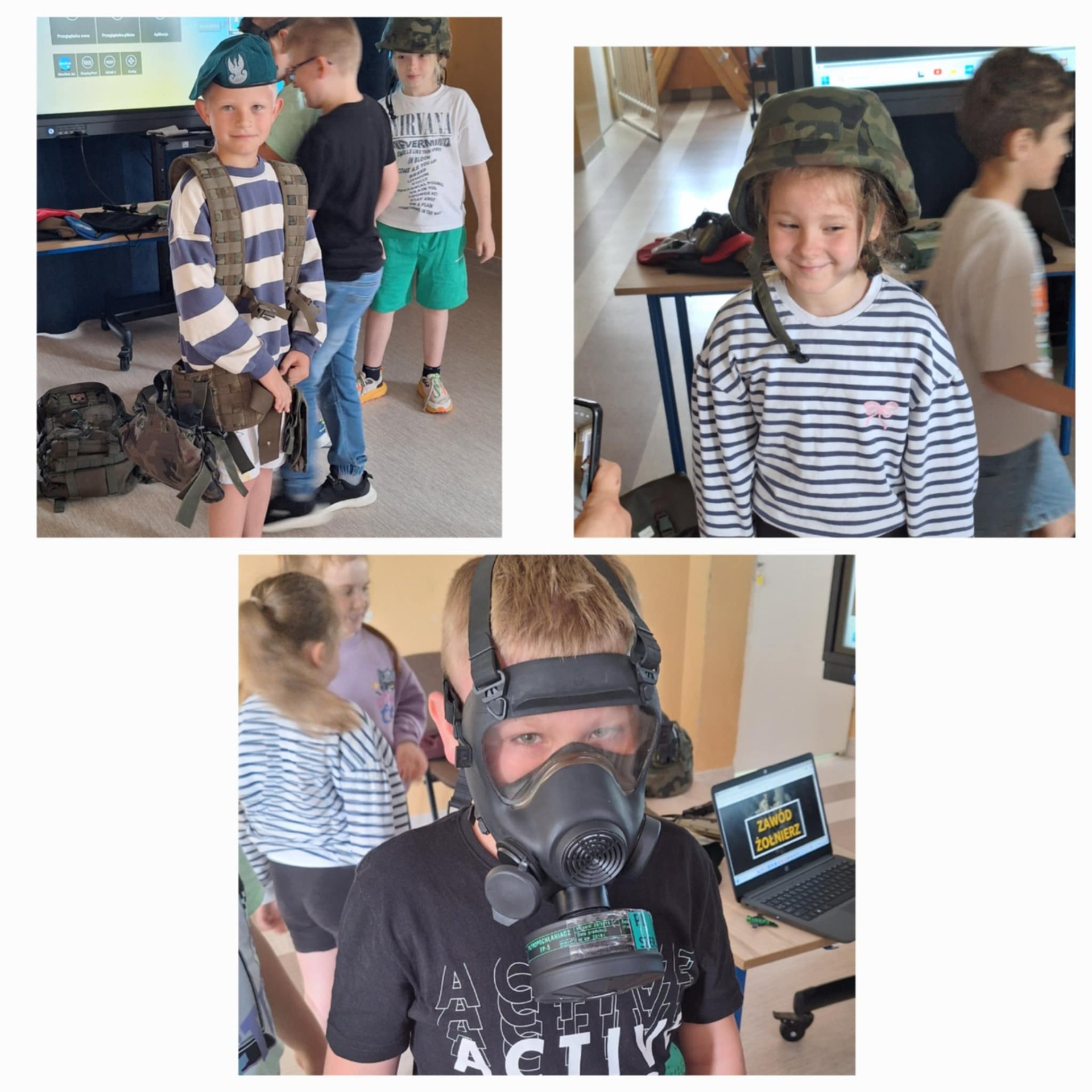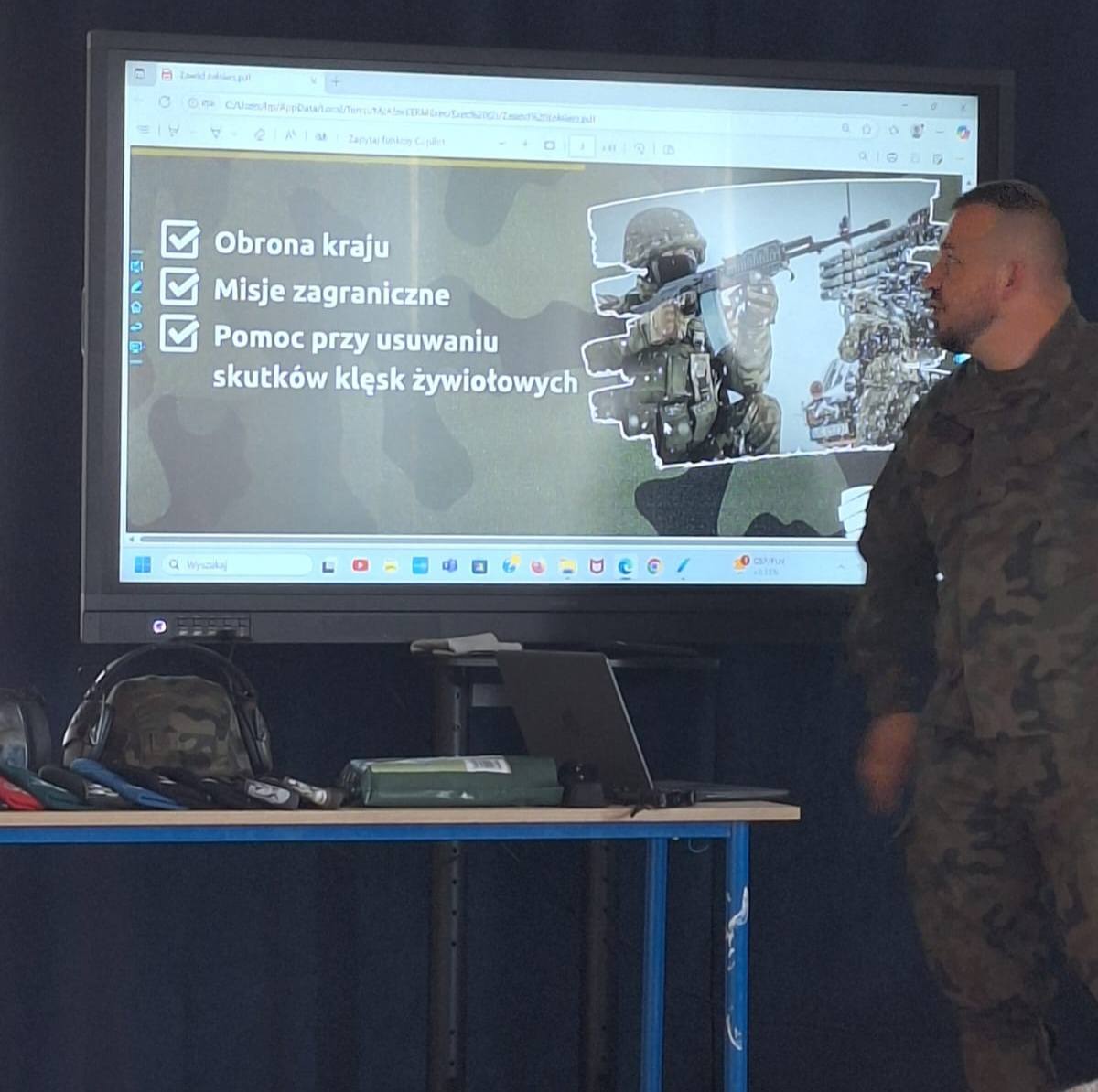Następnie uczniowie uczestniczyli w spotkaniu z żołnierzem z Wojskowego Centrum Rekrutacji w Sieradzu, który przybliżył uczniom specyfikę zawodu żołnierza, opowiedział o możliwościach i szansach jakie daje Wojsko Polskie. Dziękujemy p.Angelinie za inicjatywę spotkania.