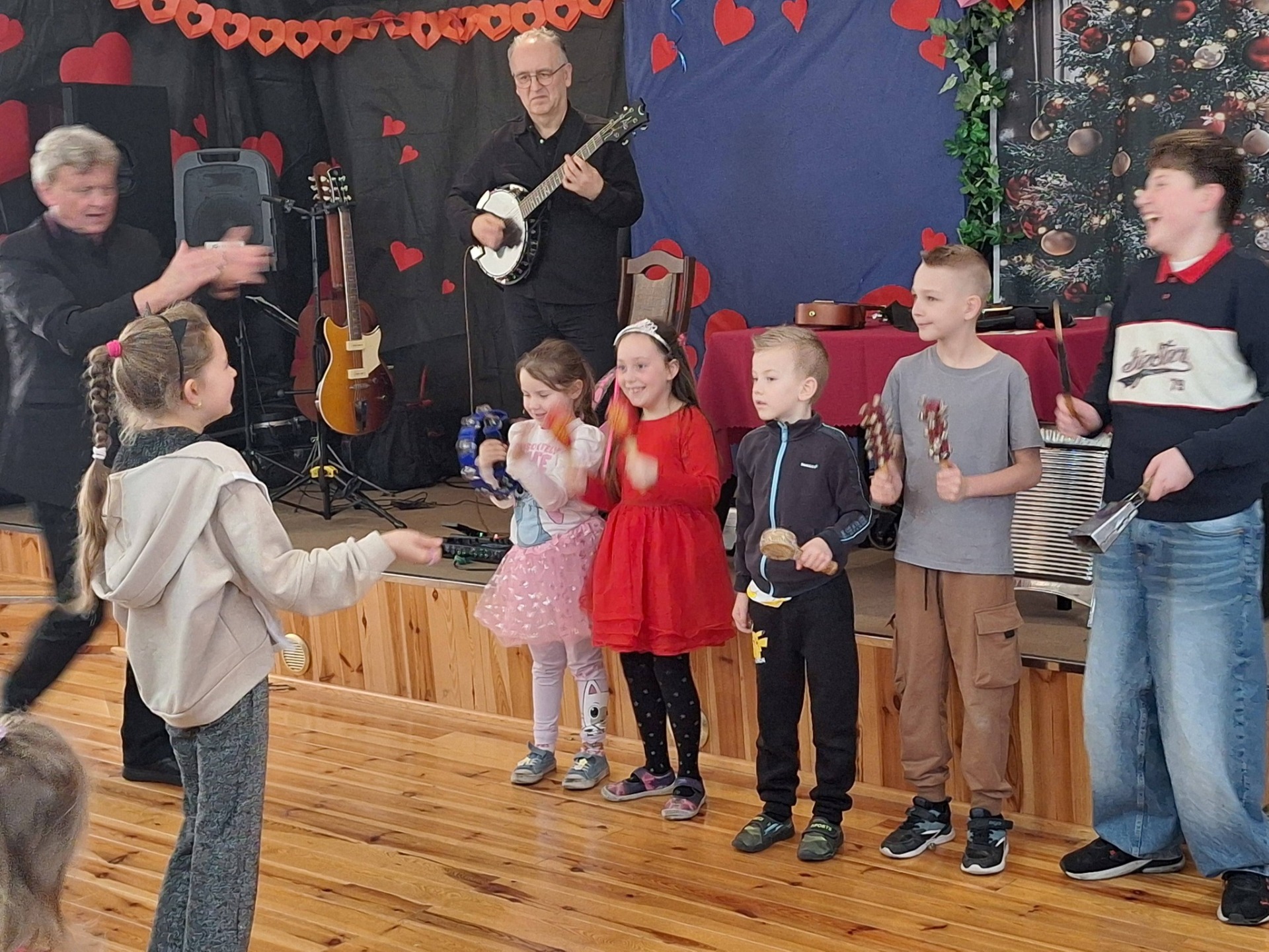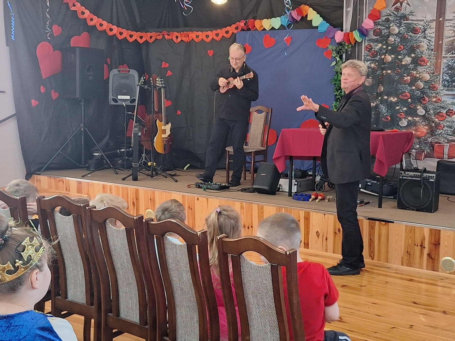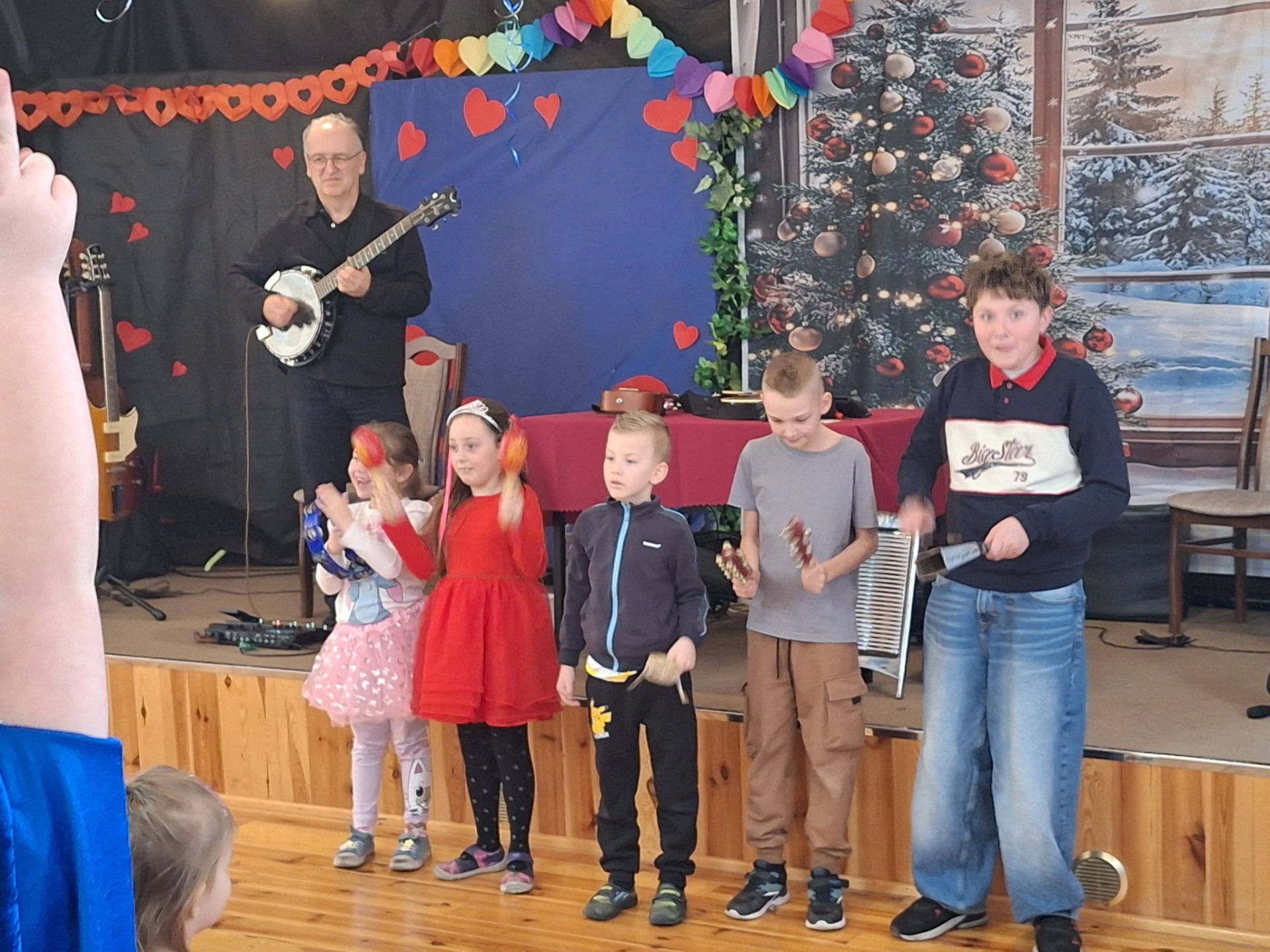 Po tańcach karnawałowych sala balowa zamieniła się w salę koncertową. Gościliśmy Duo Gitarowe. Muzycy zapoznali dzieci z sześcioma instrumentami strunowymi szarpanymi. Towarzyszyły im także niektóre instrumenty perkusyjne. Było dużo dobrej muzyki, humoru i wspólnej artystycznej zabawy.